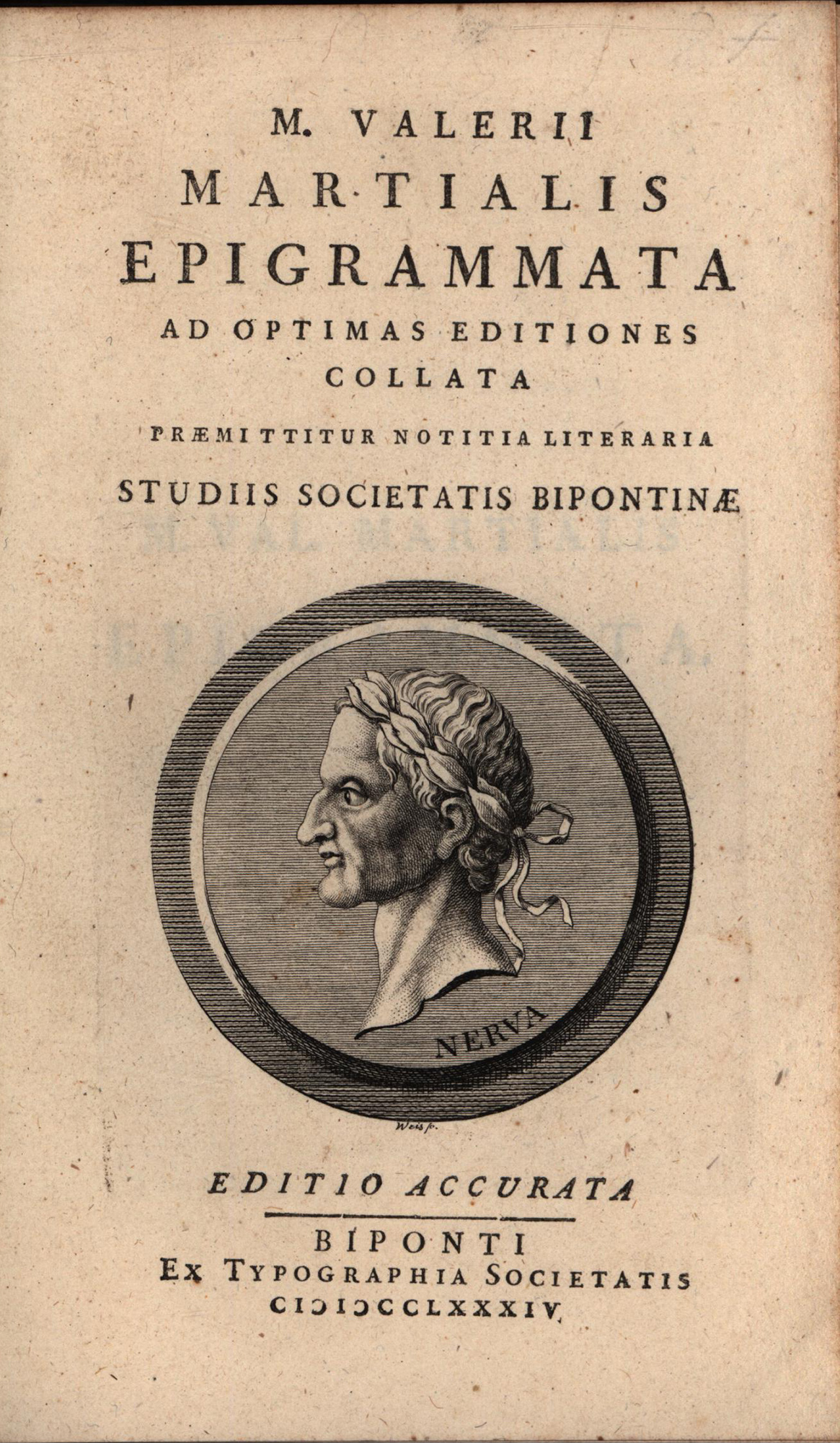 Martial: M. Valerii Martialis Epigrammata. Ad Optimas Editiones Collata. Praemittitur Notitia Literaria. Editio Accurata. 2 Bände (komplett). Biponti [Zweibrücken], Typographia Societatis, 1784. 8°. 20 x 13 cm. [1] Blatt, XL, 283 Seiten; [1] Blatt, 324 Seiten. Lederbände des 20. Jahrhunderts mit goldgeprägtem Rückentitel.