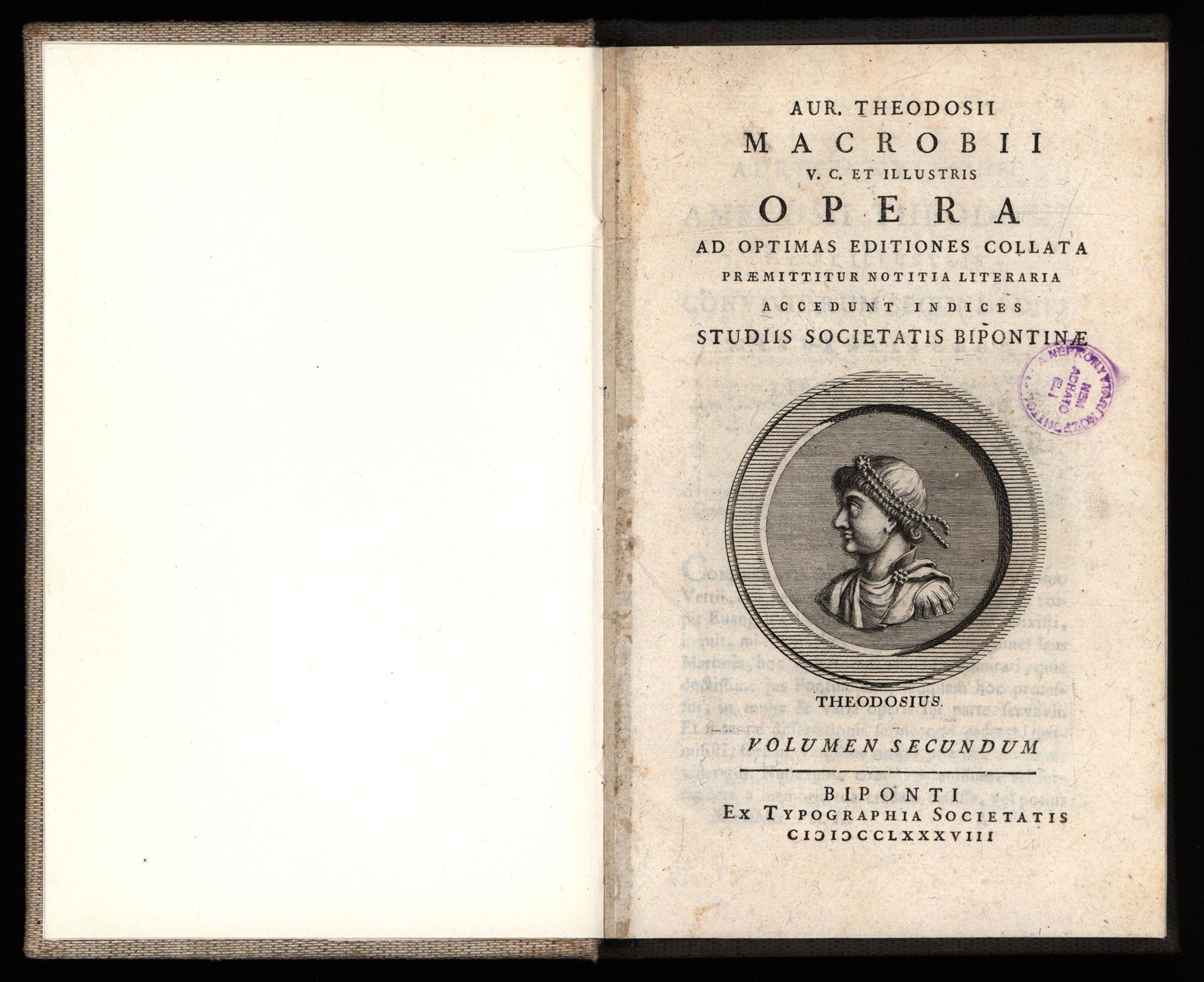 Macrobius, Ambrosius Theodosius: Aur. Theodosii Macrobii Opera Ad Optimas Editiones Collata. Editio Accurata. 2 Bände (komplett). Biponti [Zweibrücken], Ex Typogrphia Societatis, 1788. 8°. 19,5 x 13 cm. [1] Blatt, XIV, 381 Seiten; [1] Blatt, 343 Seiten, [47] Blatt. Leinenbände des 20. Jahrhunderts mit blaugeprägtem Rückentitel.