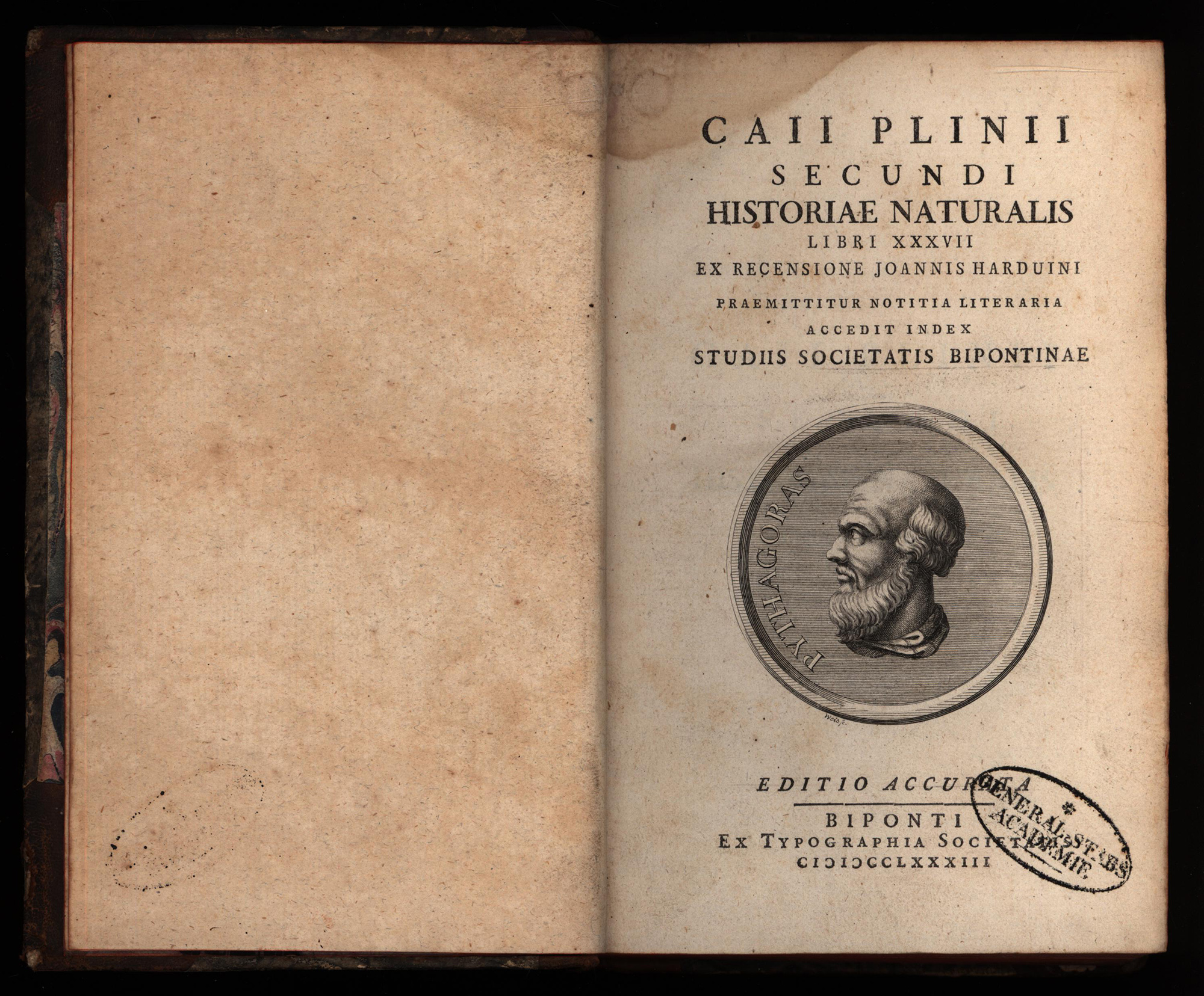 Plinius: Caii Plinii Secundi Historiae Naturalis Libri XXXVII. Praemittitur Notitia Literaria. Accedit Index Studiis Societatis Bipontinae. 5 Bände (komplett). Editio Accurata. Zweibrücken, Typographia Societatis, 1783-1784. 8°. 20 x 13 cm. XLVIII, 424 Seiten; [1] Blatt, [1] Blatt, 392 Seiten; 436 Seiten; [1] Blatt, 423 Seiten; [1] Blatt, 446 Seiten. Halblederbände der Zeit mit godlgeprägten Titeln auf Lederrückenschildern, floraler Rückenprägung in Gold, marmoriertem Deckelbzug, marmorierten Vorsätzen und Rundum-Rotschnitt.