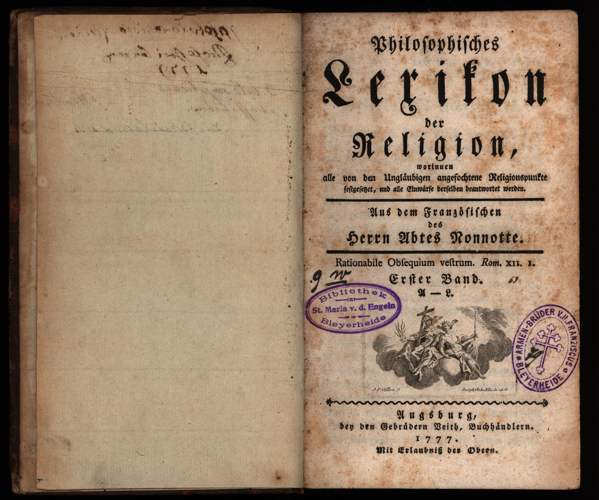Nonnotte, Claude François: Philosophisches Lexikon der Religion. Erster Band A – L. Band 1 (von 2). Augsburg, Verlag der Gebrüder Veith, 1777. 8°. 20,5 x 12,5 cm. LXXXVI, 686 Seiten. Lederband der Zeit auf 5 Bünden mit goldgeprägtem Rückentitel auf rotem Lederrückenschild und marmoriertem Schnitt.