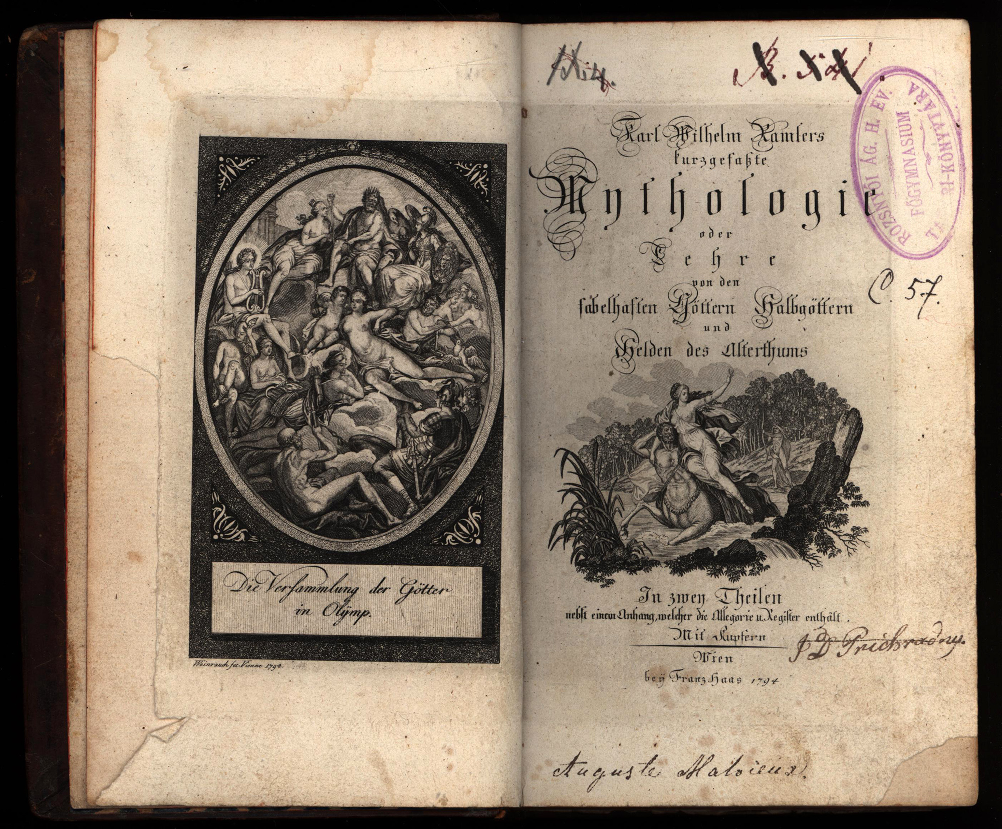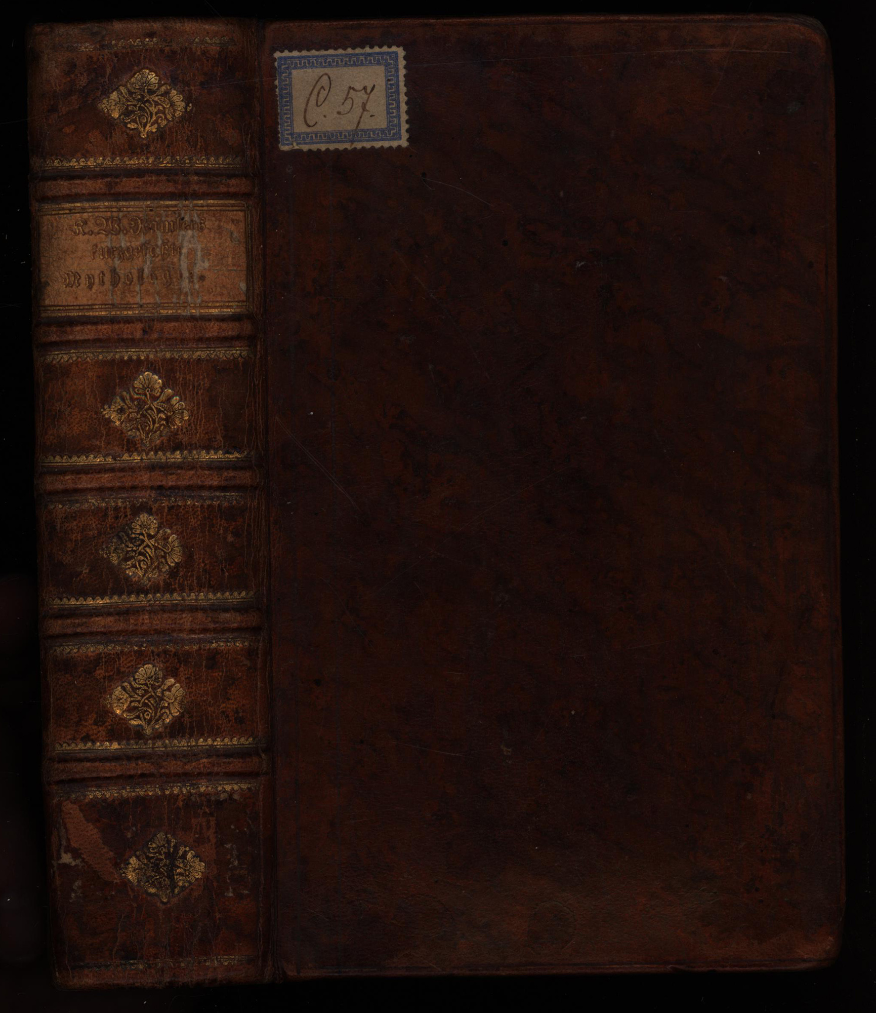Ramler, Karl Wilhelm: Kurzgefaßte Mythologie oder Lehre von den fabelhaften Göttern, Halbgöttern und Helden des Alterthums. In zwey Theilen nebst einem Anhang, welcher die Allegorie u. Register enthält. Mit Kupfern. 2 Teile (in 1 Band, komplett). Wien, Verlag Franz Haas, 1794. 8°. 19 x 12,5 cm. [1] Blatt, VIII Seiten, [2] Blatt, 499 Seiten, [2] Blatt. 18 Tafeln. Lederband der Zeit auf 5 Bünden mit goldgeprägtem Titel auf Lederrückenschild, floraler Rückenprägung, Buntpapiervorsätzen und Rundum-Rotschnitt.