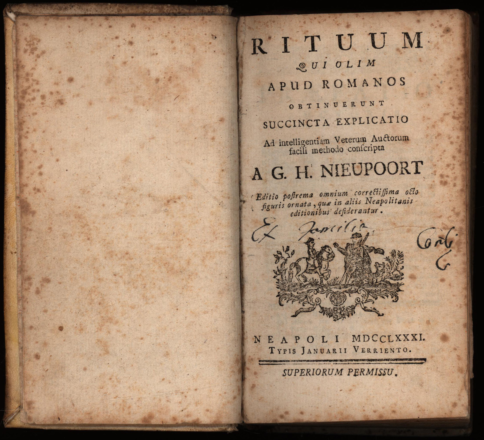 Nieupoort, Willem Hendrik: Rituum, qui olim apud Romanos obtinuerunt, succincta explicatio. Ad intelligentiam veterum auctorum facili methodo consripta. Neapel, gedruckt bei Guiseppe Verriento, 1781. Klein-8°. 16,5 x 9,5 cm. X, 576 Seiten. Schweinslederband der Zeit mit Rückentitel von alter Hand in Tinte.