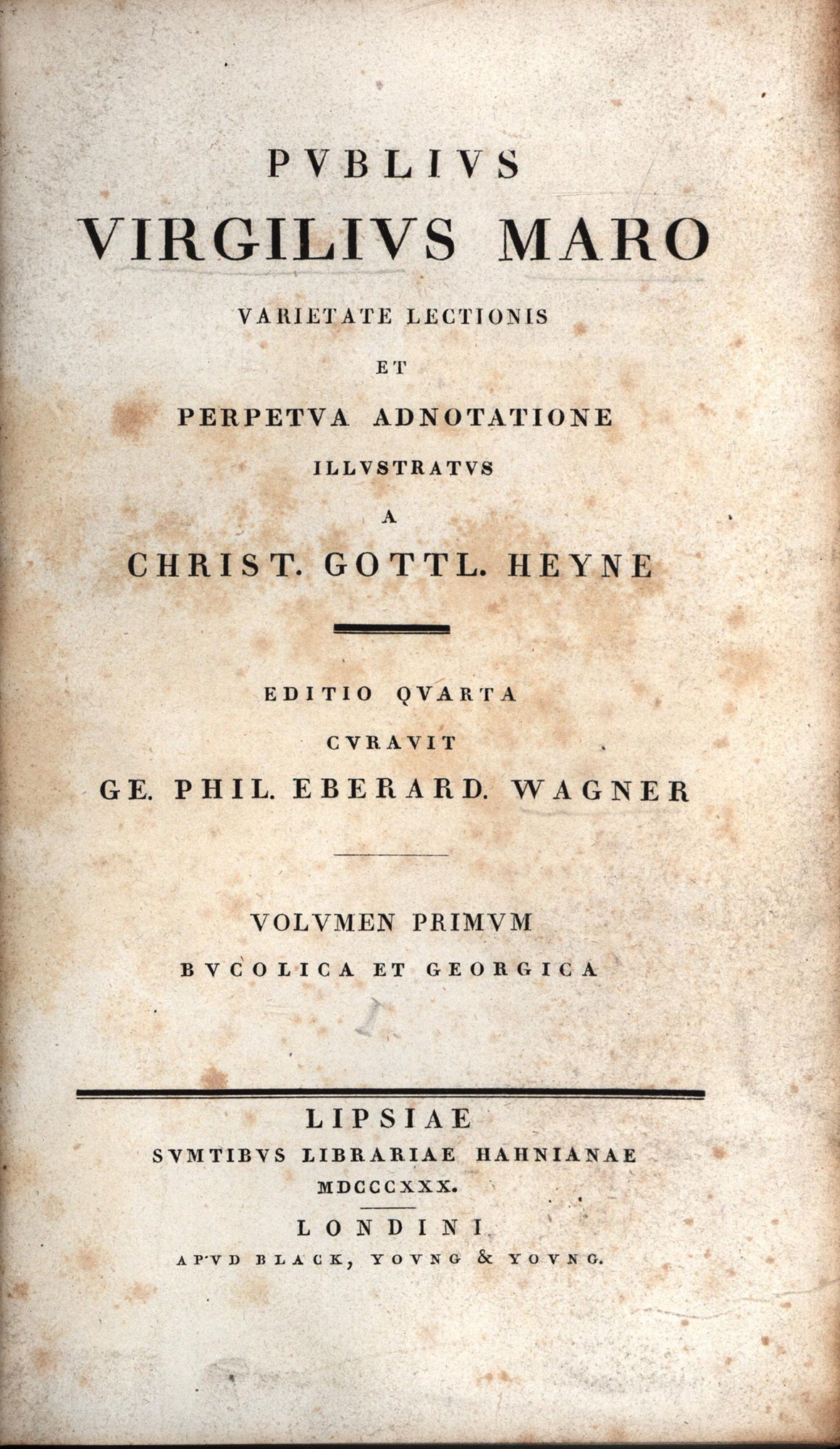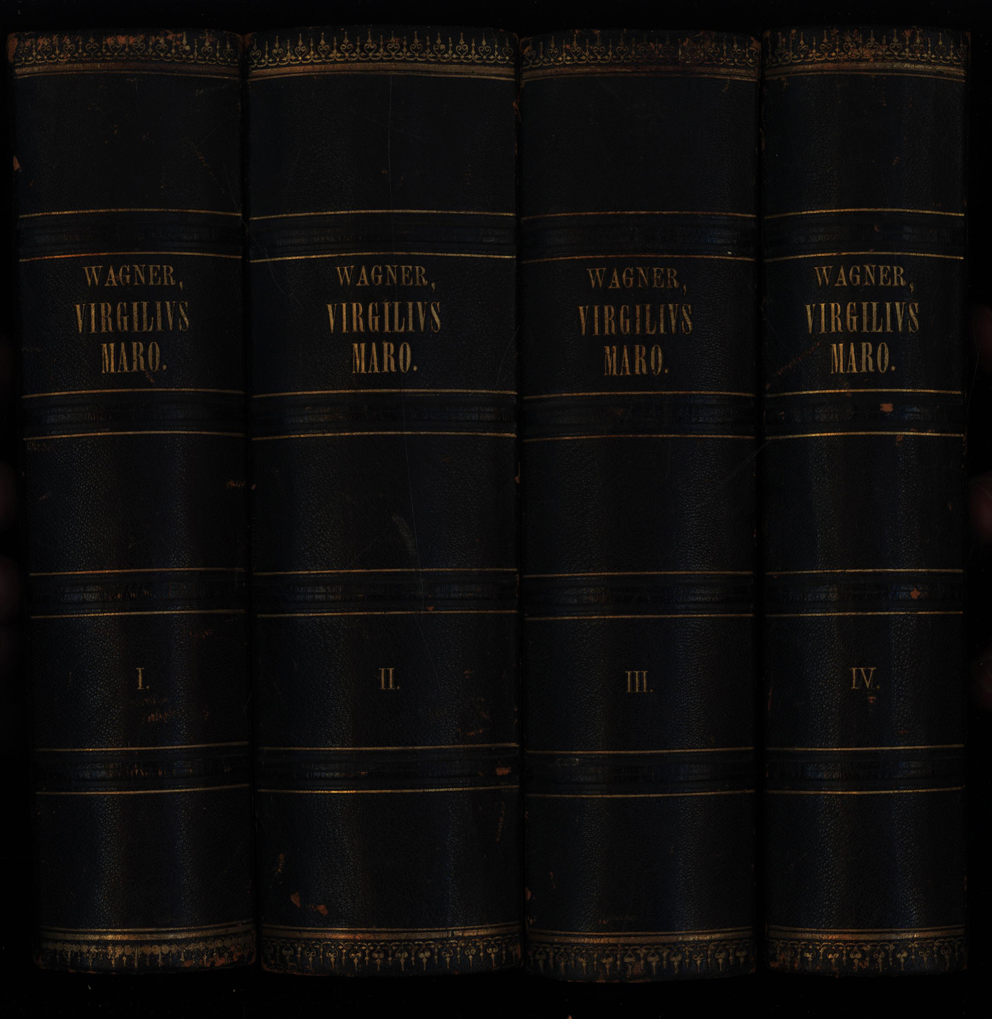 Vergil – Heyne, Christian Gottlob (Bearb.) und Wagner, Georg Philipp Eberhard (Hrsg.): Publius Virgilius Maro Varietate Lectionis Et Perpetua Adnotatione Illustratus. Editio quarta curavit Ge. Phil. Eberard. Wagner. Volumen primum: Bucolica et georgica. Volumen secundum: Aeneidis libri I-VI. Volumen tertium: Aeneidis libri VII-XII et Index notarum quibus aucta est nova editio. Volumen quartum: Carmina minora quaestiones virgilianae et notitia literaria. 4 Bände (von 59: Lipsiae [Leipzig], Liberaria Hahniana [Verlag Hahnsche Buchhandlung], 1830-1833. Groß-8°. 23 x 15 cm. CLX, 698 Seiten, [1] Blatt; [1] Blatt, 1044 Seiten, [1] Blatt; [1] Blatt, 894 Seiten; XVI, 749 Seiten, [1] Blatt. Halblederbände der Zeit auf 4 Bünden mit goldgeprägten Rückentiteln und Rückenfileten.