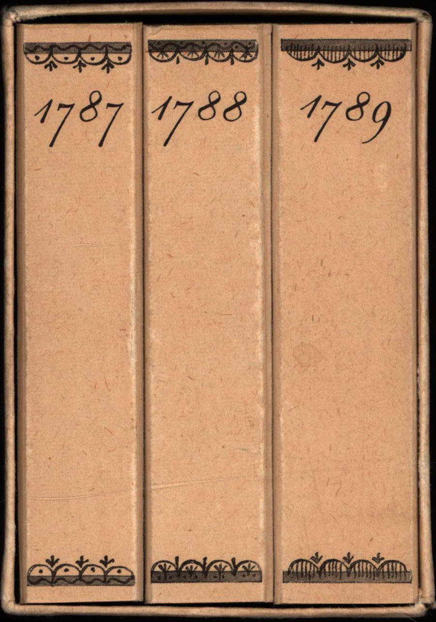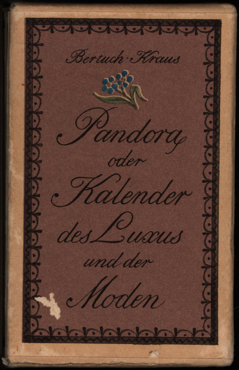 Bertuch, Friedrich Justin und Kraus, Georg Melchior: Pandora oder Kalender des Luxus und der Moden für das Jahr 1787, 1788 [und] 1789. 3 Bände (komplett). Zürich/München, Artemis Verlag, 1979. Klein-8°. 10,5 x 6,5 x 7,5 cm. [19] Blatt, 175 Seiten, [16] Blatt; [22] Blatt, 164 Seiten; [21] Blatt, 155 Seiten, [1] Blatt. Mit 102 Tafeln. Illustrierte Original-Pappbände mit Rundum-Goldschnitt im illustrierten Original-Pappschuber.