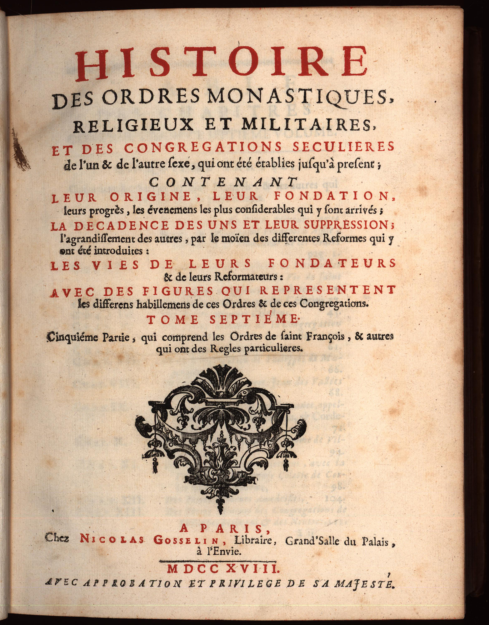 Hélyot, Hippolyte: Histoire Des Ordres Monastiques, Religieux Et Militaires Et Des Congrégations Séculières de l’un & de l’autre sexe, qui ont esté éstablies jusqu’à présent. Tome 7: Cinquième Partie, qui comprend les Ordres de saint François, & autres qui ont des Regles particulieres. Band 7 (von 8). Paris, Verlag Gosselin (gedruckt bei Coignard), 1718. 4°. 25,5 x 20 cm. [4] Blatt, 493 Seiten, [17] Blatt. 72 Tafeln. Lederband der Zeit auf 5 Bünden mit reicher Rückenvergoldung, Lederrückenschildchen in Rot und Grün, marmorierten Vorsätzen und rotem Sprengschnitt.
