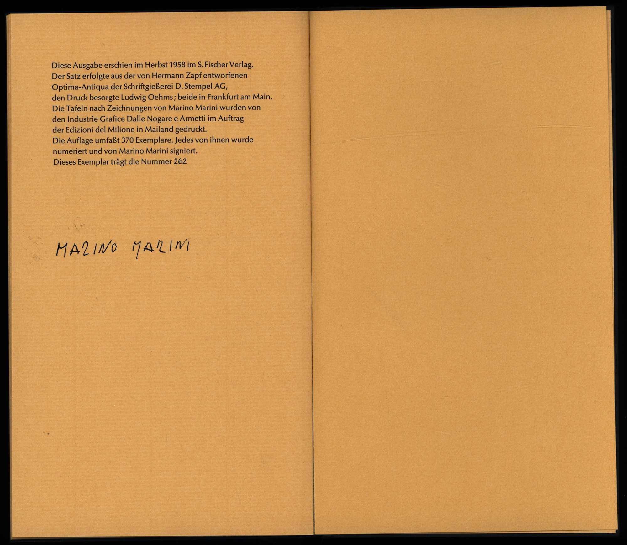 Nummer 262 von 370 nummerierten und von Marino Marini signierten Exemplaren. Der Satz erfolgte aus der von Hermann Zapf entworfenen Optima-Antiqua der Schriftgiesserei D. Stempel AG, Druck besorgte Ludwig Oehms, beide Frankfurt am Main. Mit 6 Illustrationen. Schuber leicht gedunkelt. Sehr gutes Exemplar. Number 262 of 370 copies of the limited edition, signed by Marino Marini. With 6 illustrations. Slip case a little darkened Fine condition.