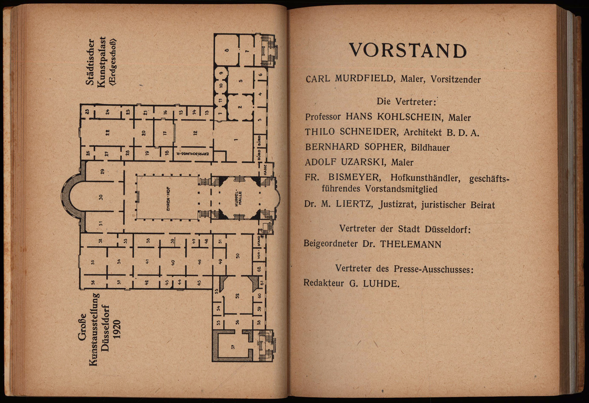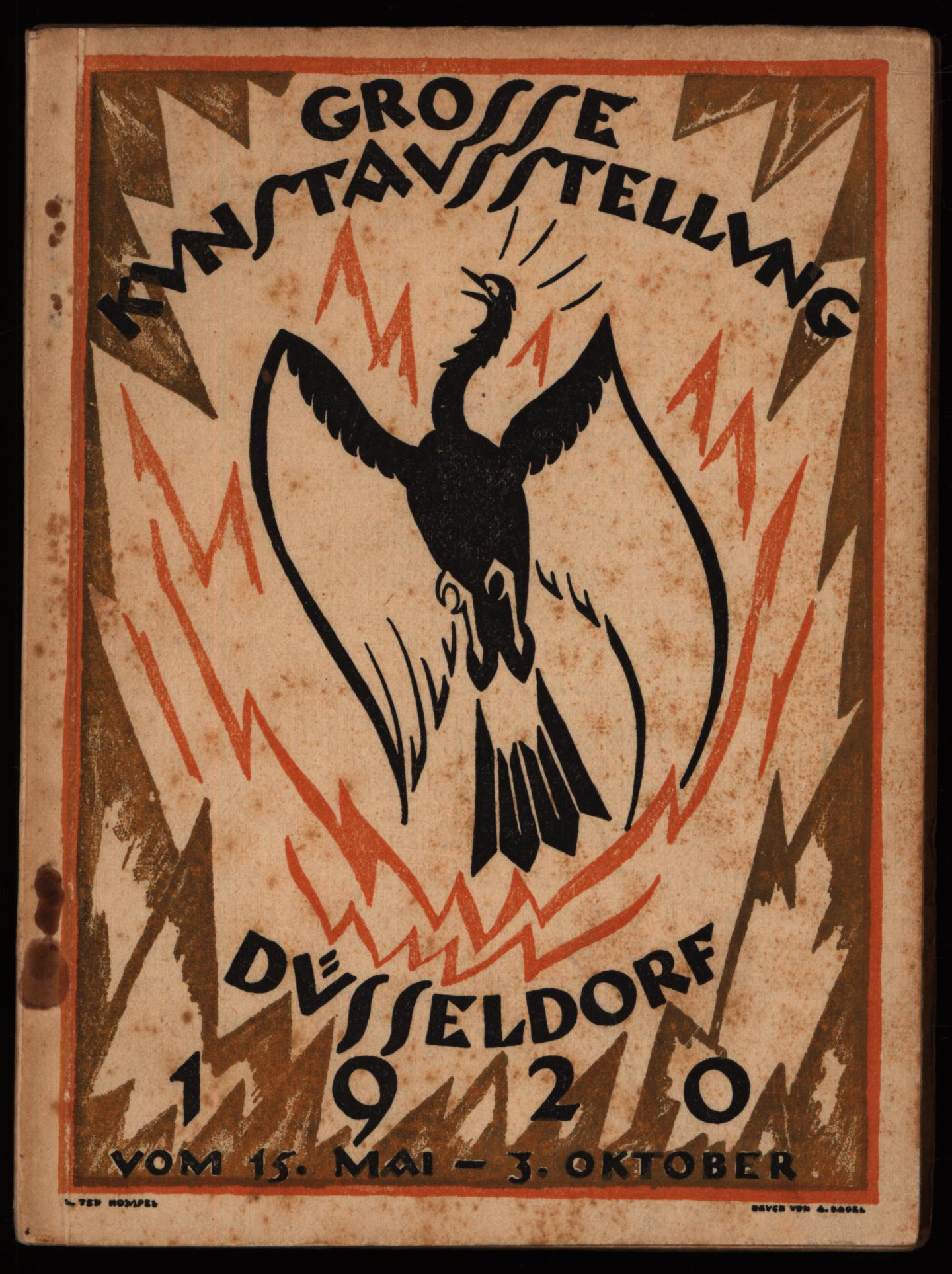 Katalog der Grossen Kunstausstellung im Städtischen Kunstpalast Düsseldorf 1920. Veranstaltet vom Verein zur Veranstaltung von Kunstausstellungen e.V. in Verbindung mit der Arbeitsgemeinschaft der Bildenden Künstler Düsseldorfs. Vom 15. Mai – 3. Oktober. Düsseldorf, Verlag des Vereins zur Veranstaltung von Kunstausstellungen, 1920. Klein-8°. 15 x 11,5 cm. 136, 64 Seiten, XXXXVIII Seiten Werbeanzeigen der Zeit. Original-Broschur.