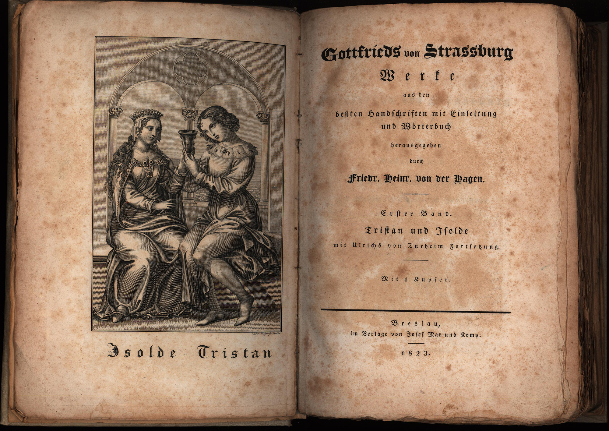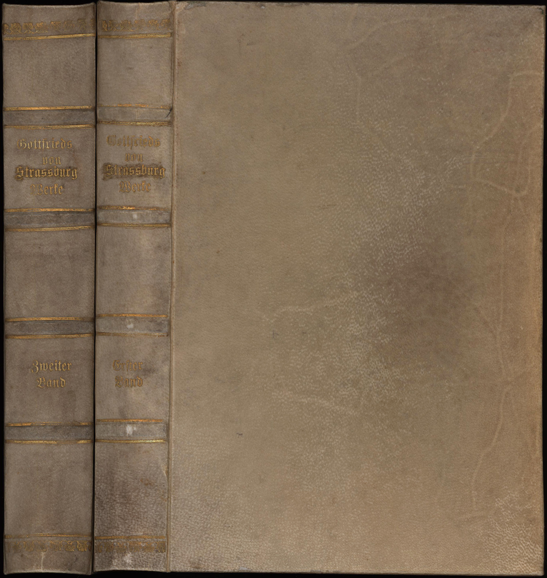 Gottfried von Straßburg – Hagen, Friedrich Heinrich von der (Hrsg.): Gottfrieds von Strassburg Werke aus den beßsten Handschriften mit Einleitung und Wörterbuch herausgegeben. Erster Band: Tristan und Isolde mit Ulrichs von Turheim [Türheim] Fortsetzung. Zweiter Band: Heinrichs von Friberg Fortsetzung von Gottfrieds Tristan. Gottfrieds Minnelieder. Die alten französischen, englischen, wallisischen und spanischen Gedichte von Tristan und Isolde. 2 Bände (komplett). Breslau, Verlag Josef Max, 1823. Groß-8°. 24,5 x 17 cm. [1] Blatt, XIV, 321 Seiten; [1] Blatt, 461 Seiten, [1] Blatt. Frontispiz. Pergamentbände etwas späterer Zeit auf 4 Zierbünden mit goldgeprägten Rückentiteln, goldgeprägten Rückenfileten und eingebundenen Original-Interimsbroschuren.
