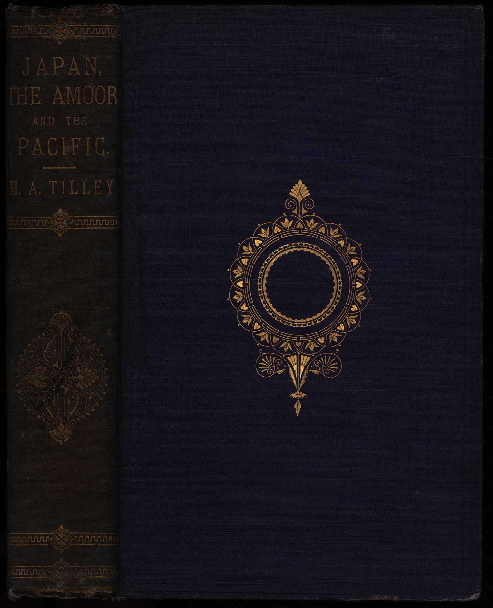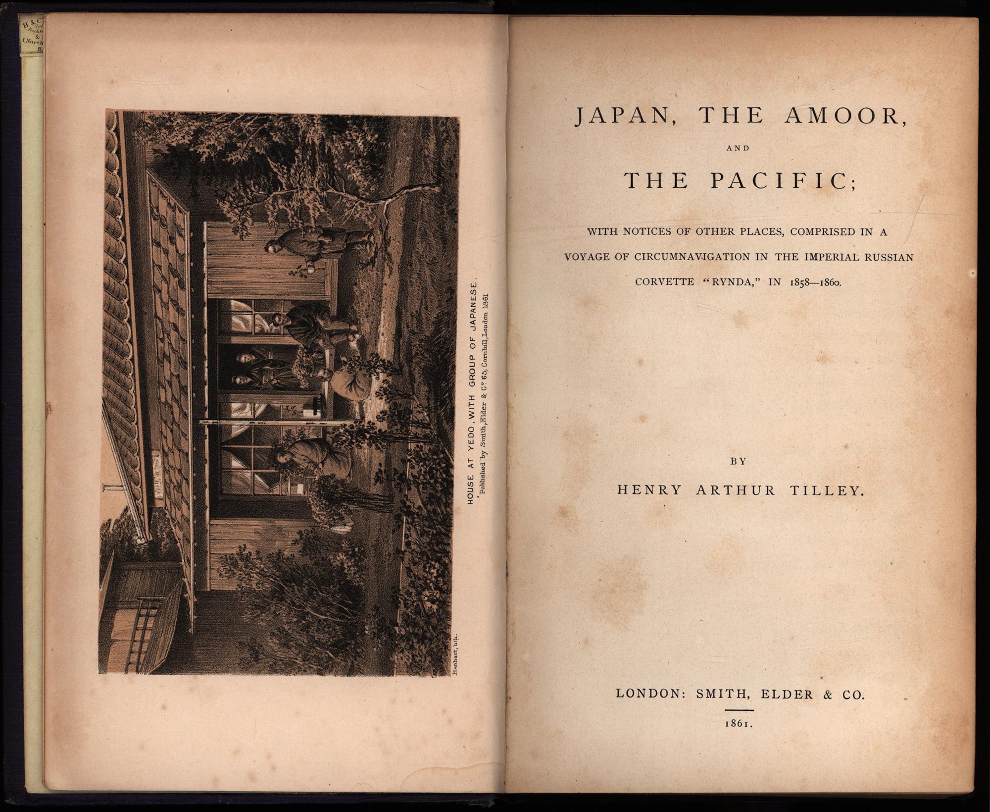 Tilley, Henry Arthur: Japan, the Amoor and the Pacific with notices of other places, comprised in a voyage of circumnavigation in the imperial Russian corvette „Rynda,“ in 1858-1860. London, Verlag Smith, Elder and Co., 1861. 8°. 22,5 x 15 cm. 8 Tafeln. Blind- und goldgeprägter Original-Leinenband mit Rundum-Goldschnitt.