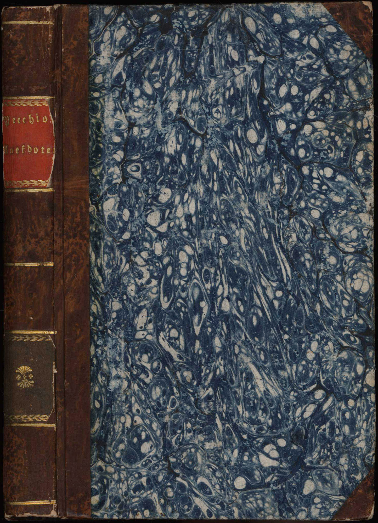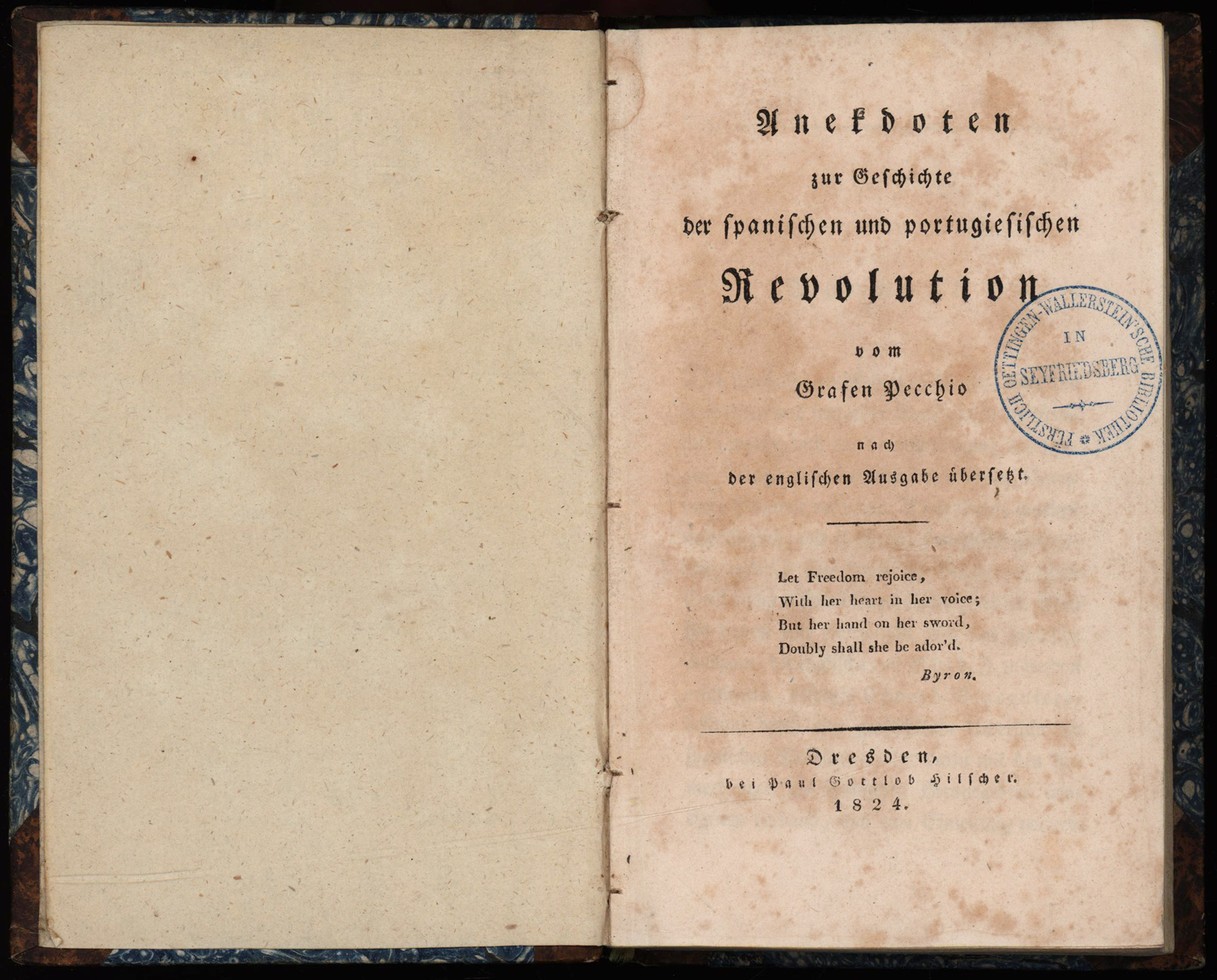 Pecchio, Giuseppe: Anekdoten zur Geschichte der spanischen und portugiesischen Revolution vom Grafen Pecchio nach der englischen Ausgabe übersetzt. Dresden, Verlag Paul Gottlob Hilscher, 1824. Klein-8°. 17 x 11 cm. [2] Blatt, 220 Seiten. Pappband der Zeit mit goldgeprägten Rückenschildchen in Rot und Grün mit marmoriertem Deckelbezug.