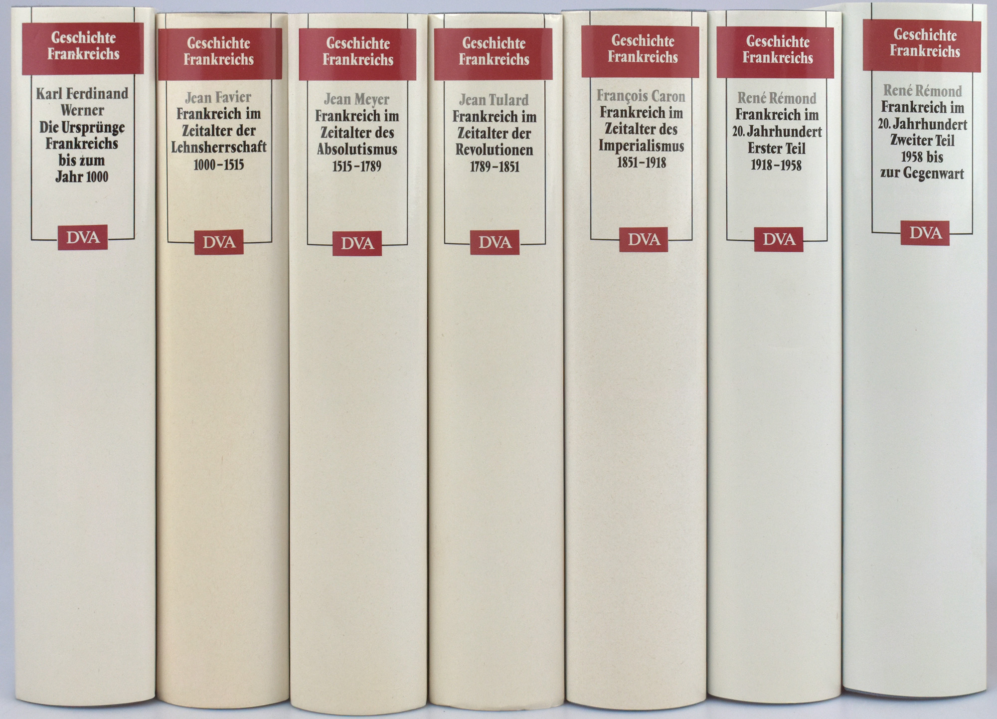 Favier, Jean (Hrsg.): Geschichte Frankreichs. Band 1: Karl Ferdinand Werner: Die Ursprünge Frankreichs bis zum Jahr 1000. Band 2: Jean Favier: Frankreich im Zeitalter der Lehnsherrschaft 1000-1515. Band 3: Jean Meyer: Frankreich im Zeitalter des Absolutismus 1515-1789. Band 4: Jean Tulard: Frankreich im Zeitalter der Revolutionen 1789-1851. Band 5: Frankreich im Zeitalter des Imperialismus 1851-1918. Band 6: Frankreich im 20. Jahrhundert. Teil 1: 1918-1958. Teil 2: 1958 bis zur Gegenwart. 6 Bände (in 7 Teilbänden, komplett). Stuttgart, Deutsche Verlags-Anstalt, 1989-1995. 8°. 22 x 15,5 cm. 655; 547; 575; 547; 727; 568; 635 Seiten. Original-Leinenbände mit Original-Schutzumschlägen.
