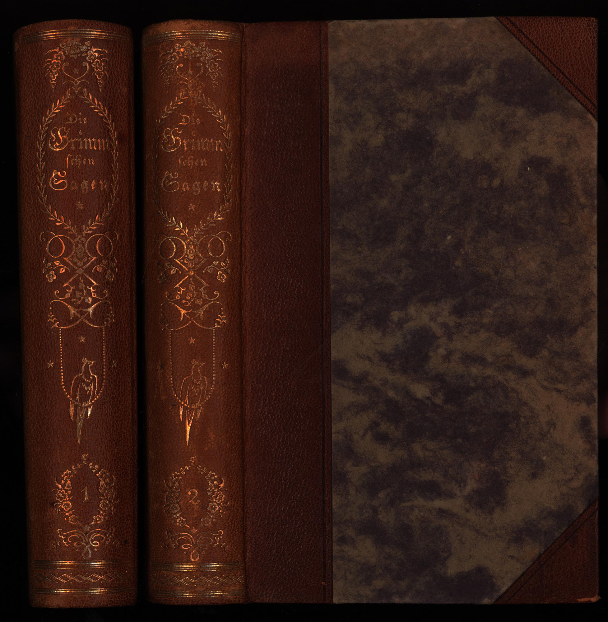 Grimm, Jacob und Wilhelm – Floerke, Hanns (Hrsg.): Deutsche Sagen. Gesammelt durch die Brüder Grimm. Neu herausgegeben und mit einem Nachwort versehen von Hanns Floerke. 2 Bände (komplett). Berlin, Propyläen Verlag, 1911. 8°. 19 x 12,5 cm. XXIX, 374; XX, 339 Seiten. Halblederbände der Zeit mit reicher Rückenvergoldung, marmoriertem Deckelbezug und schwarzem Kopfschnitt.