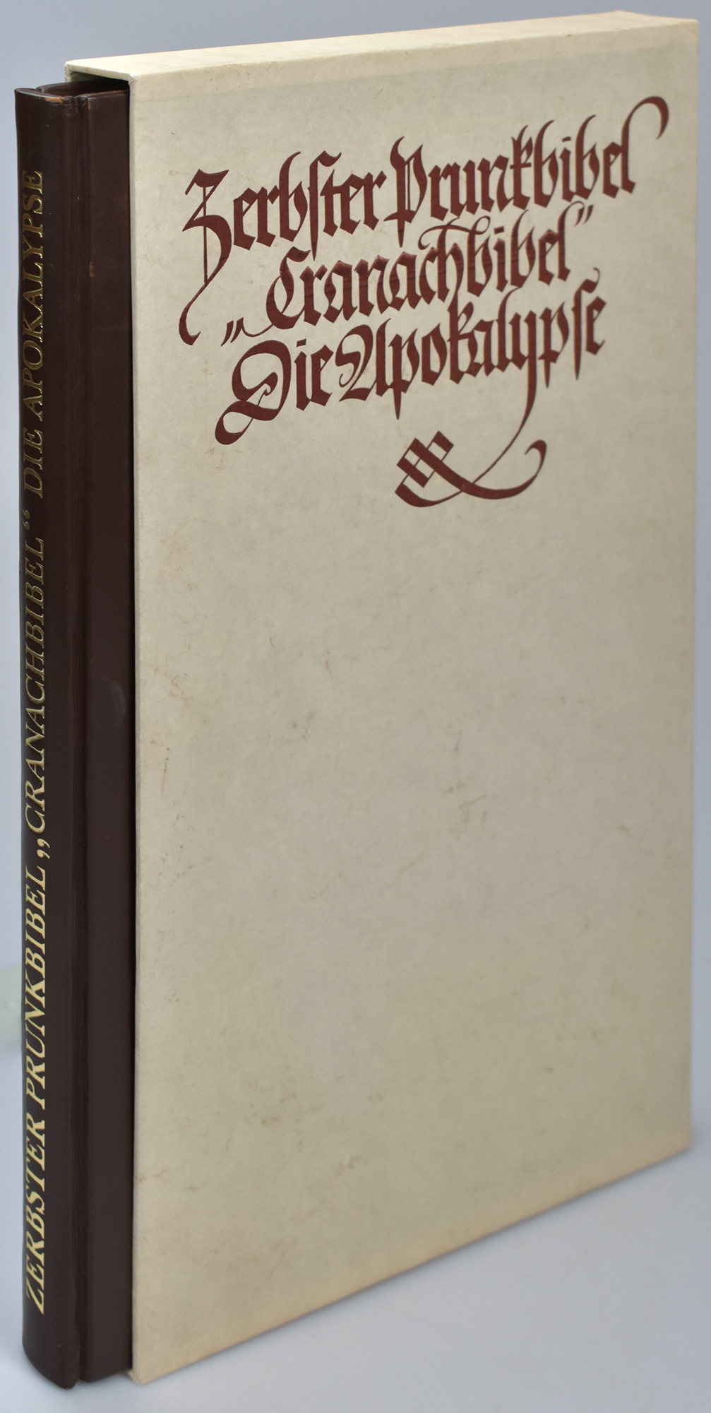 Original leather binding in the original card slipcase. Number 474 of 800 copies of the facsimile edition of the Apocalypse from the Zerbster Prunkbibel (“Cranach Bible”), based on Martin Luther’s translation, printed in 1541 by Hans Lufft in Wittenberg and illustrated with coloured woodcuts from the workshop of Lucas Cranach the Younger. With 26 colour miniatures heightened in gold and decorative initials. Binding slightly rubbed, otherwise fine copy.
