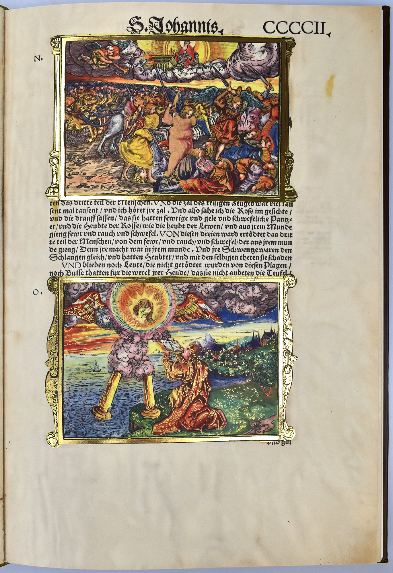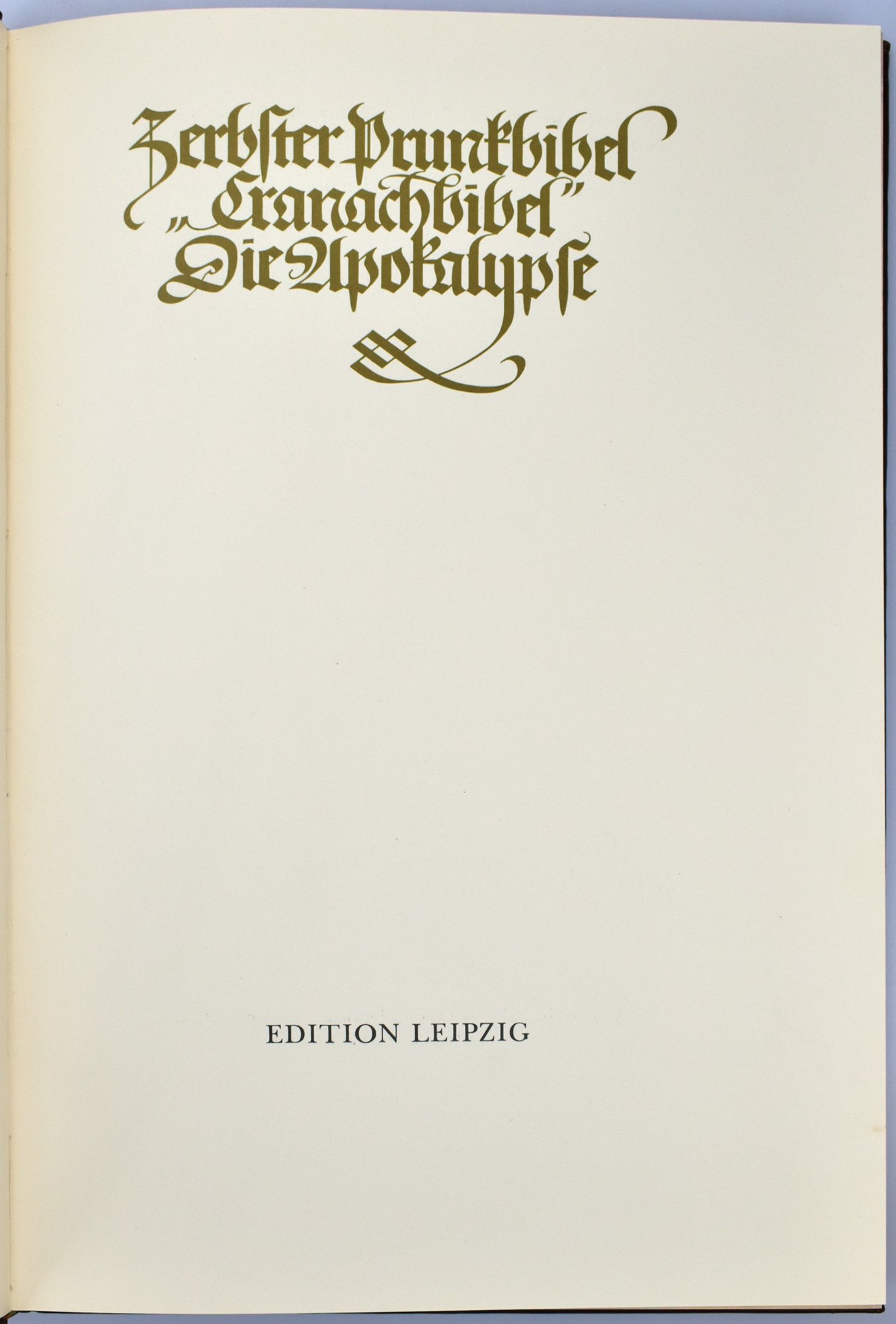 Zerbster Prunkbibel. „Cranachbibel“, die Apokalypse. [Faksimileausgabe]. Leipzig, Edition Leipzig, 1973. 2°. 41 x 28 cm. Blatt CCCXCIIII – CCCCX (beidseitig bedruckt), XVI Seiten. Original-Lederband im Original-Pappschuber.