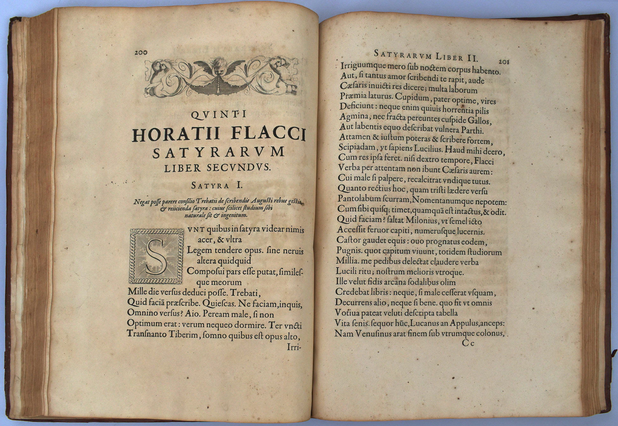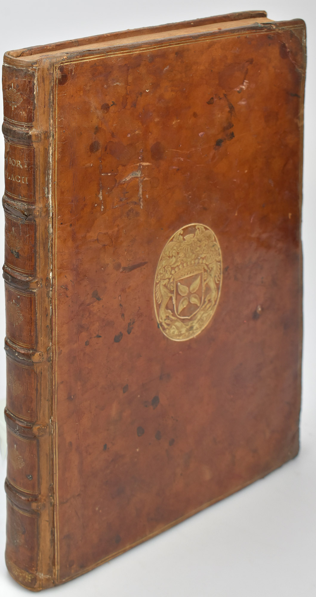 Horaz: Quinti Horatii Flacci Opera. Parisiis [Paris], Typographia regia, 1642. 2°. 39,5 x 29 cm. [1] Blatt, 321 Seiten. Fachmännisch restaurierter Lederband der Zeit auf 6 Bünden mit goldgeprägten Rücken- und Deckelfileten, goldgeprägtem Supralibros und rotem Sprengschnitt.