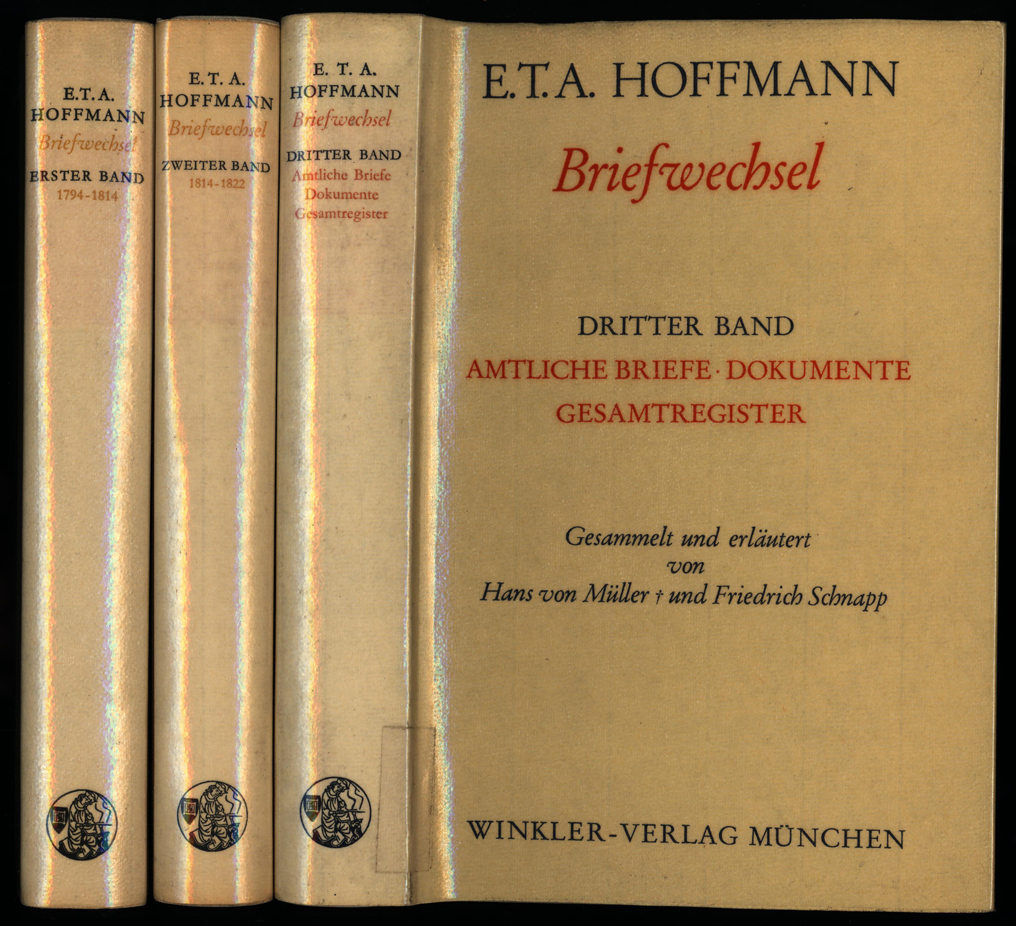 Hoffmann, E. T. A. – Schnapp, Friedrich [Hrsg.]: E. T. A. Hoffmanns Briefwechsel. Band 1: Königsberg bis Leipzig 1794 – 1814. Band 2: Berlin 1814-1822. Band 3: Nachträgliches, Urkunden, Anzeigen, Offene Briefe, Amtliche Briefe, Die Affäre des „Meisters Floh“, Testament, Tod und Begräbnis, Der Nachlaß und die Hinterbliebenen, Stammtafel, Register zu Band I-III. Gesammelt und erläutert von Hans von Müller und Friedrich Schnapp. 3 Bände (komplett). Darmstadt, Wissenschaftlich Buchgesellschaft, 1967-1969. Groß-8°. 24,5 x 16,5 cm. 493, 430 (1) und 493 (2) Seiten. Original-Leinenbände mit goldgeprägten Rückentiteln und Original-Schutzumschlägen.