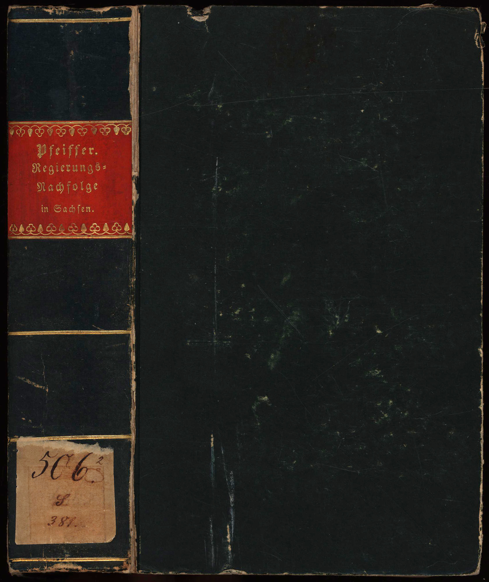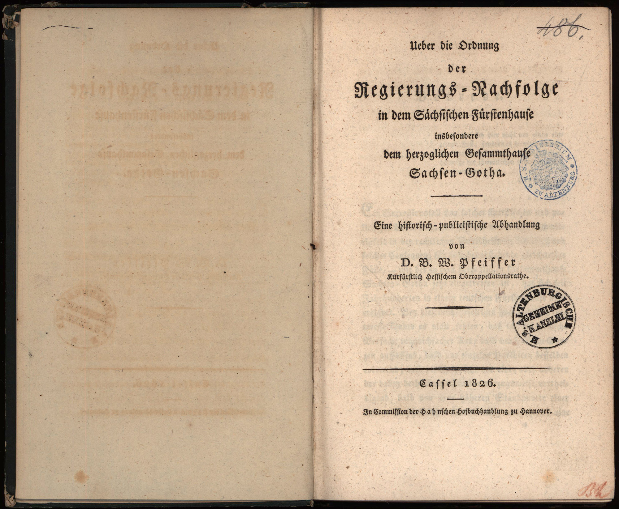 Pfeiffer, Burkard Wilhelm: Ueber die Ordnung der Regierungs-Nachfolge in dem Sächsischen Fürstenhause, insbesondere dem herzoglichen Gesammthause Sachsen-Gotha. Eine historisch-publicistische Abhandlung. Cassel, In Commission der Hahnschen Hofbuchhandlung zu Hannover, 1826. 8°. 20 x 13 cm. X, 824 Seiten, 2 Blatt. Gebundener Original-Pappband der Zeit mit goldgeprägtem Rückentitel.