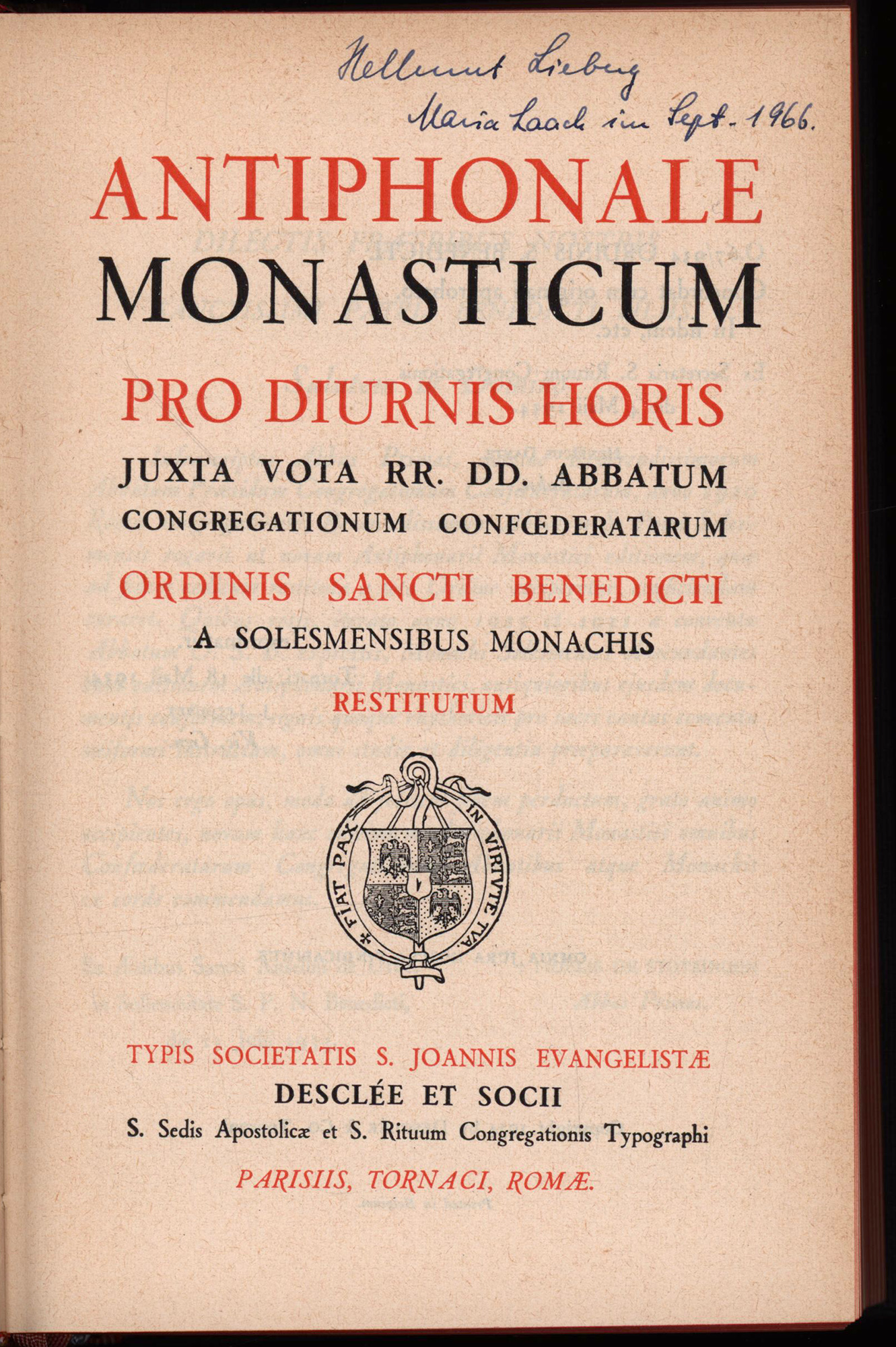 Antiphonale monasticum pro diurnis horis. Juxta vota rr. dd. abbatum congregationum confoederatarum Ordinis Sancti Benedicti a Solesmensibus monachis restitutum. Parisiis, Tornaci und Romae, Desclée, 1934. 8°. 21 x 14 cm. XXXIV, 1292, 32, 8 Seiten. Original-Leinenband mit goldgeprägtem Rückentitel und rotem Farbschnitt.