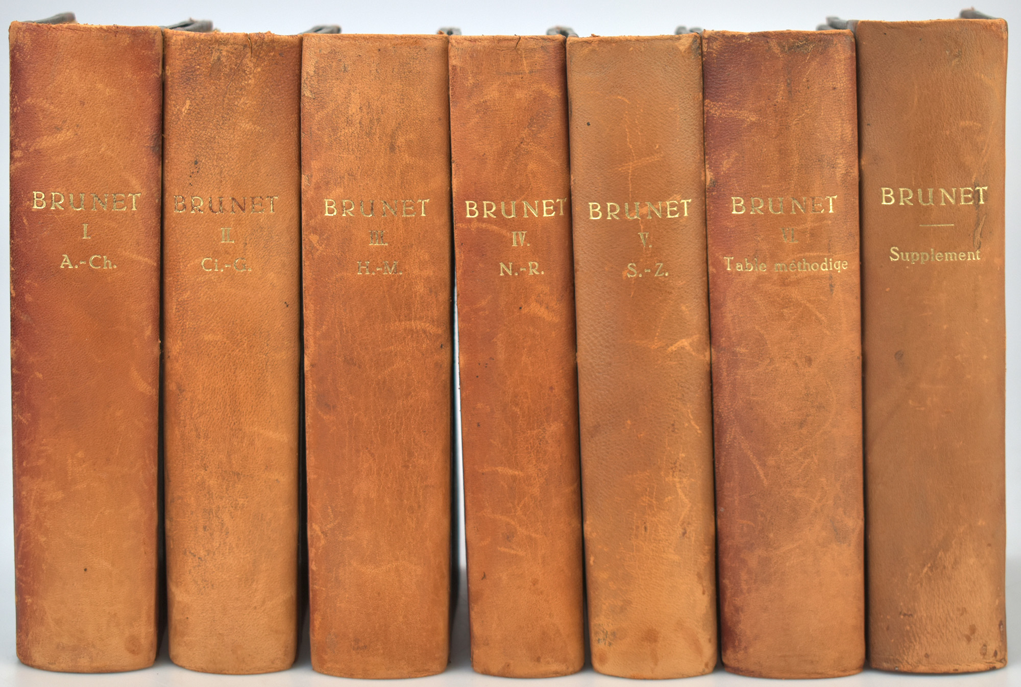 Brunet, Jacques-Charles: Manuel du libraire et de l’amateur de livres. Tome 1: AA – Chytraeus. Tome 2: Ciacconius – Gyron. Tome 3: Haag – Myvyrian. Tome 4: Naasefe – Rzaczynski. Tome 5: Sa – Zyl. Tome 6: Table methodique. Notice des journaux. Supplement. 6 Bände (komplett) + Supplementband. Berlin, Altmann, 1922. Groß-8°. 23 x 16 cm. xivj Seiten, 1902 Spalten, iv Seiten, 1848, 1984, 1476, 1700 Spalten, lxij Seiten, 1878 Spalten, viii Seiten, 1592 Spalten. Original-Halblederbände mit goldgeprägten Rückentiteln.