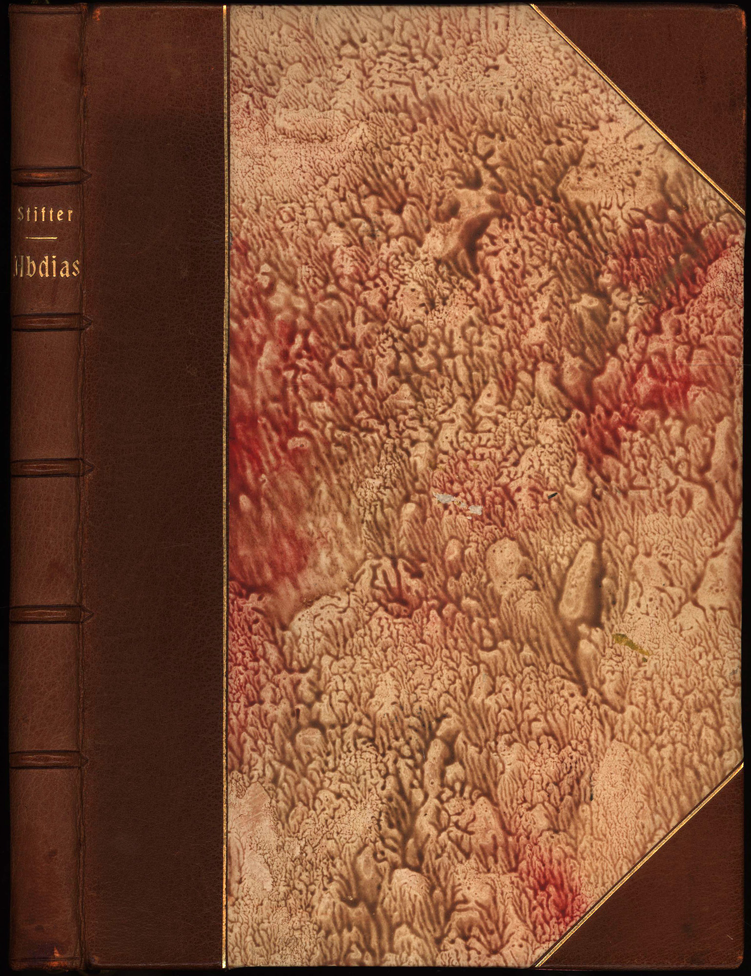 Stifter, Adalbert: Abdias. Eine Erzählung. München, Verlag Hans von Weber, 1923. 4°. 25,5 x 18 cm. 125 Seiten. Handeinband in Halbleder auf 5 Zierbünden mit goldgeprägtem Rückentitel, Deckelfileten und Kopfgoldschnitt. (= Dreiangeldrucke, Band 18).