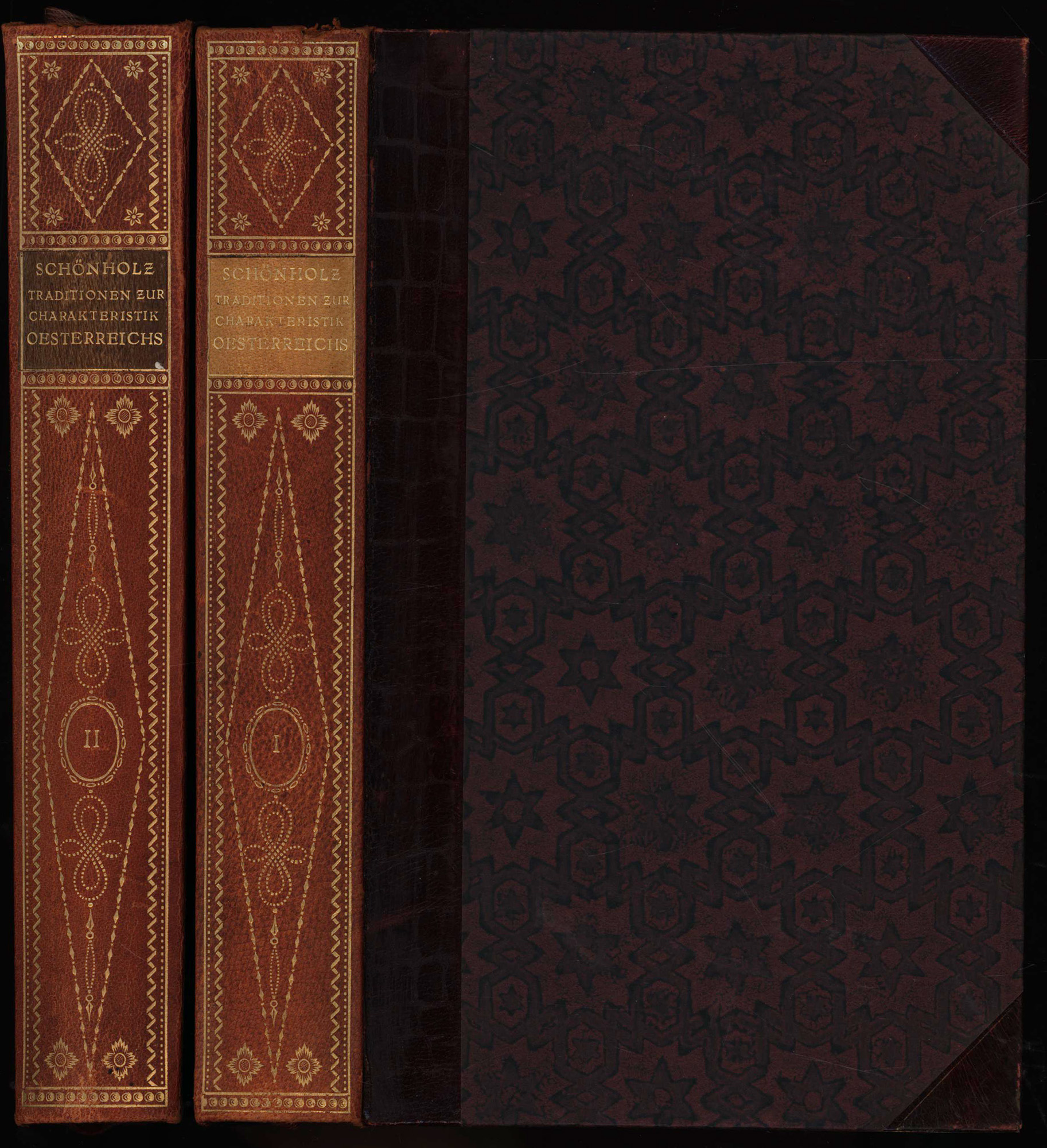 Schönholz, Friedrich Anton von: Traditionen zur Charakteristik Österreichs, seines Staats- und Volkslebens unter Franz I. 2 Bände (komplett). München, Verlag Georg Müller, 1914. 8°. 21 x 14 cm. XLII, 322; 361 Seiten. Original-Halblederbände mit reicher Rückenvergoldung, goldgeprägten Titeln auf Lederrückenschildchen, Buntpapier-Deckelbezug und Rundum-Gelbschnitt. ( = Denkwürdigkeiten aus Altösterreich, Band 3 und 4).