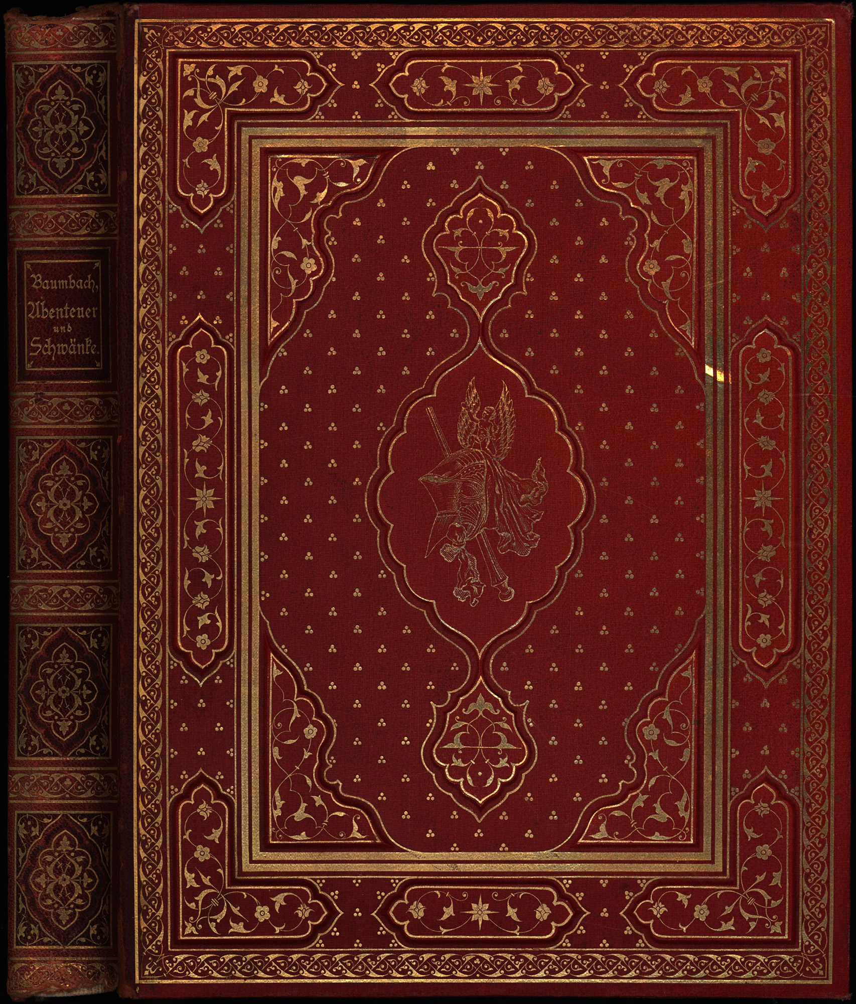 Baumbach, Rudolf: Abenteuer und Schwänke. Alten Meistern nacherzählt. Leipzig, Verlag von A.G. Liebeskind, 1885. 4°. 26 x 20,5 cm. 232 Seiten. Dekorativer roter Halblederband mit reicher Blind- und Goldprägung, illustrierten Vorsätzen und Rundum-Goldschnitt.