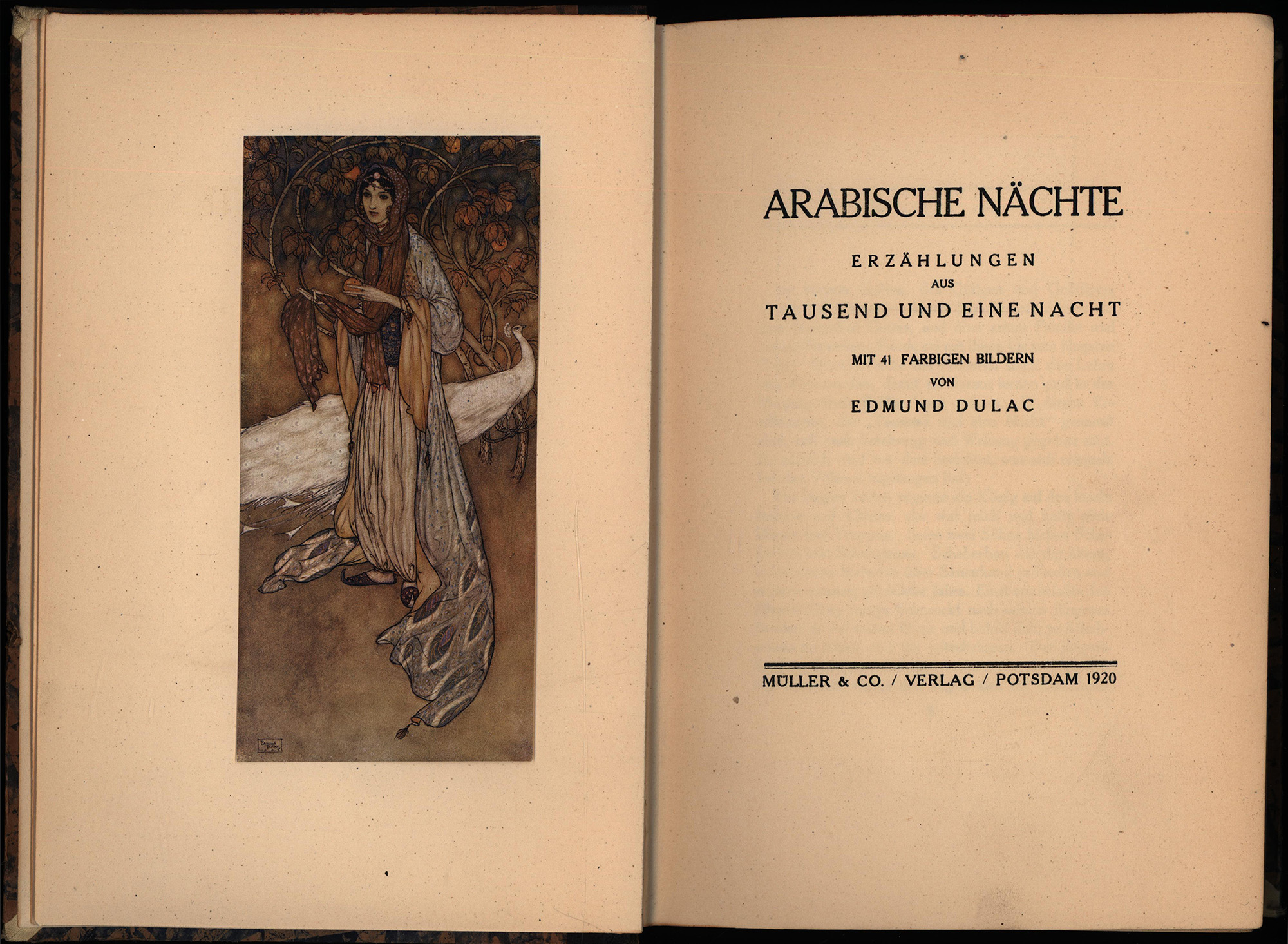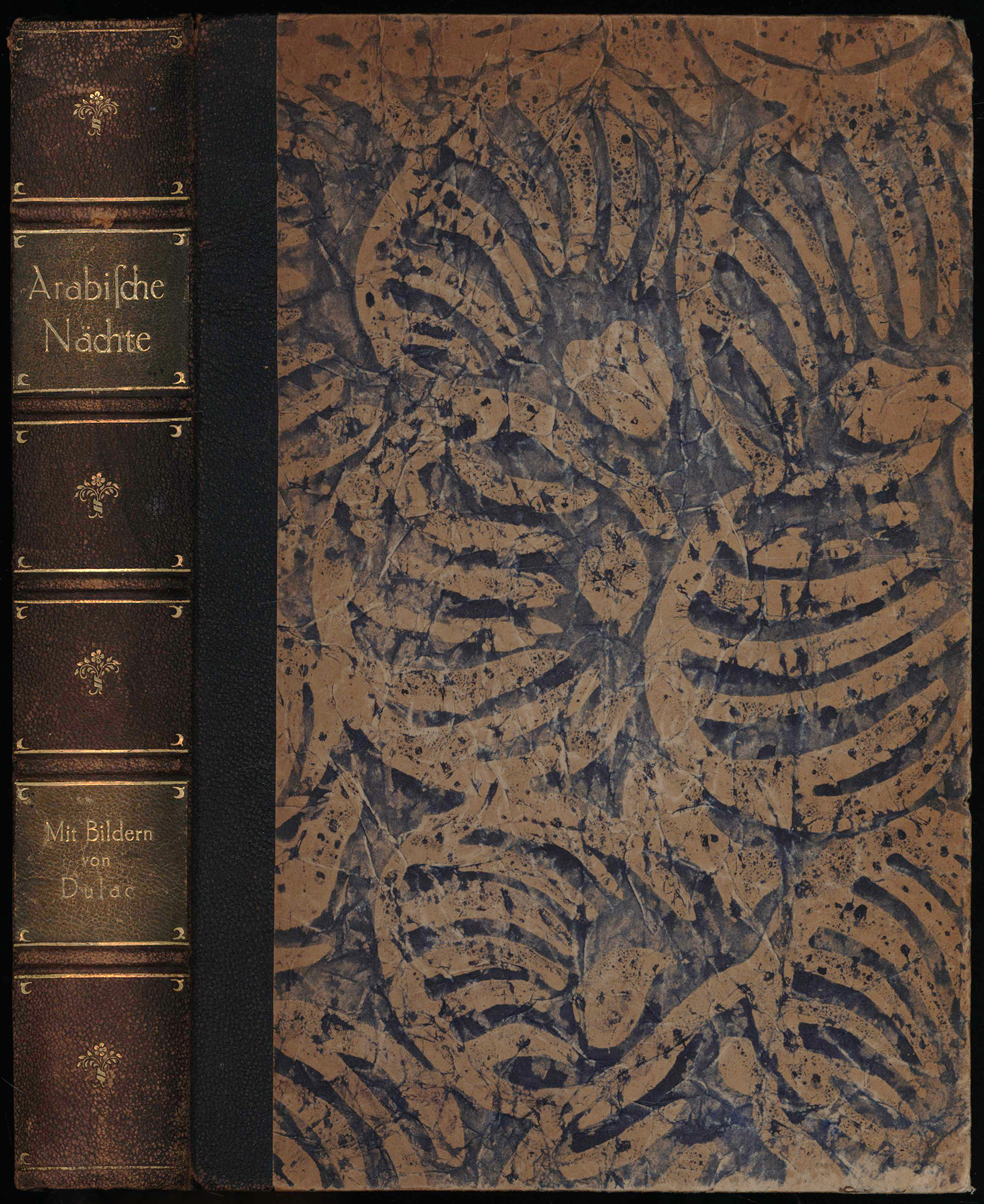 Dulac, Edmund: Arabische Nächte. Erzählungen aus Tausend und eine Nacht. Mit 41 farbigen Bildern von Edmund Dulac. Potsdam, Müller & Co. Verlag, 1920. 4°. 26 x 19 cm. 235 Seiten. Original-Halblederband mit goldgeprägtem Rückentitel auf 2 Lederschildchen. Kopfgoldschnitt.