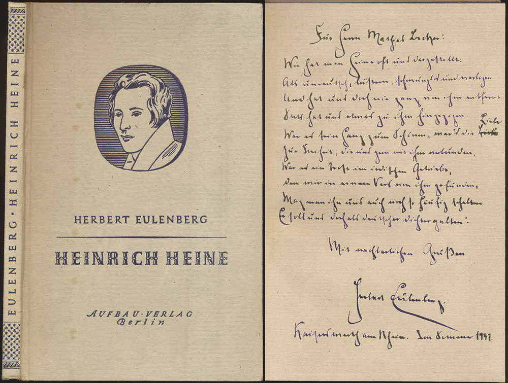 Eulenberg, Herbert: Heinrich Heine. [Widmungsexemplar.] Berlin, Aufbau-Verlag, 1947. 8°. 19 cm. 95 Seiten. Original-Pappband. Mit Deckelillustration.