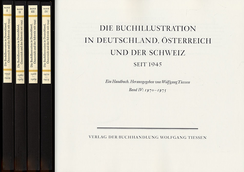 Tiessen, Wolfgang [Hrsg.]: Die Buchillustration in Deutschland, Österreich und der Schweiz seit 1945. Ein Handbuch. Herausgegeben von Wolfgang Tiessen. Band 1: 1945 – 1959. Mit einem einleitenden Essay von Hans Adolf Halbey. Band 2: 1960 – 1965. Band 3: 1966 – 1969. Mit einer Einleitung von Jan Tschichold. Band 4: 1970 – 1975. 4 Bände. Neu-Isenburg, Verlag der Buchhandlung Wolfgang Tiessen, 1968-1976. Quer-8°. 19 x 22 cm. 19 Seiten, 200 Blatt, 47, 9, 21, 29 Seiten. Original-Leinenbände mit aufgeklebten Rückenschildchen.