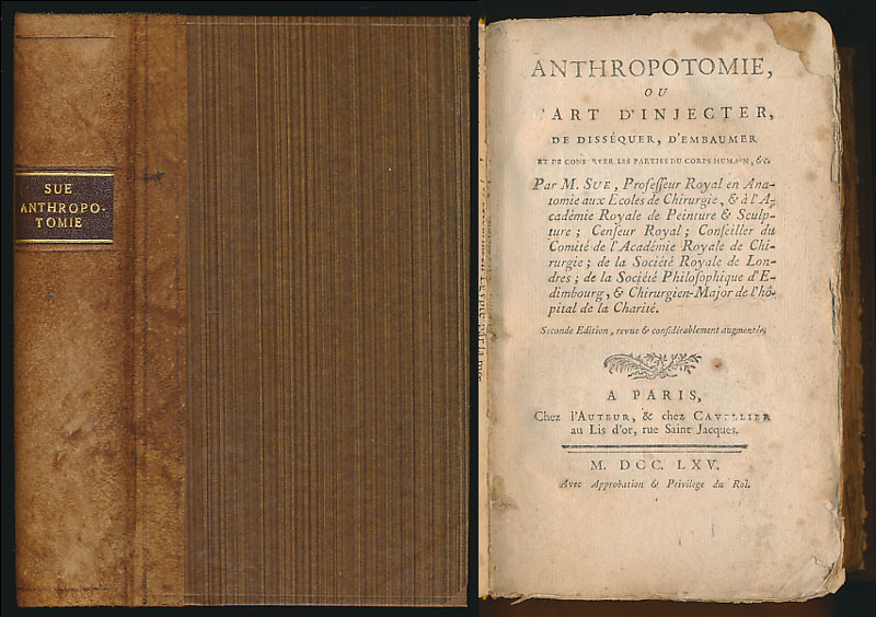 Sue, Jean Joseph: Anthropotomie, ou l’art d’injecter, de disséquer, d’embaumer et de conserver les parties du corps humain, etc. Seconde Edition, revue & considerablement augmentee. Paris, Cavellier au Lis d’or, Rue Saint Jacques, 1765. 8°. 19 cm. XX, 291 Seiten. Neuer Halblederband mit goldgeprägtem Rückentitel.