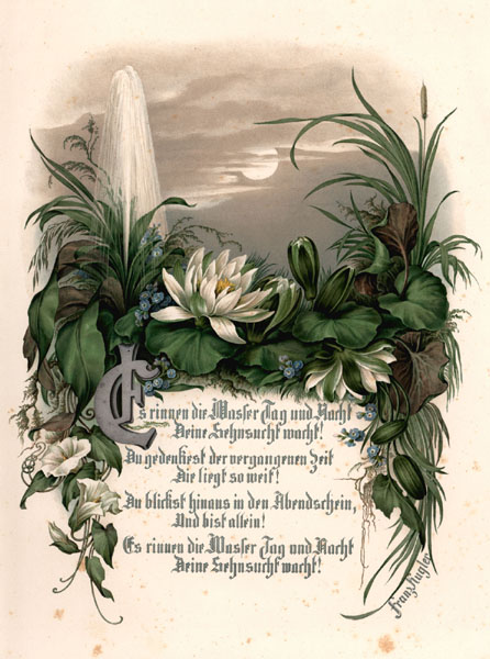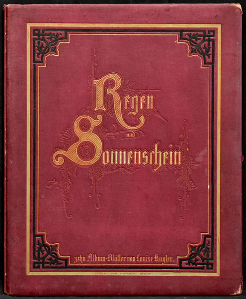Kugler, Luise (Louise): Regen und Sonnenschein. Zehn Album-Blätter. Berlin, Verlag von R. Wagner. o.J. 2°. 42 x 34 cm. 11 Blatt. Roter Original-Leinenband mit goldgeprägtem Deckeltitel. (Charlotte Louise Kugler, geboren 10.10.1811 in Stettin, gestorben 06.09.1884 in Bremen, war eine deutsche Malerin und Schülerin von Carl Joseph Begas an der Preußischen Akademie der Künste).