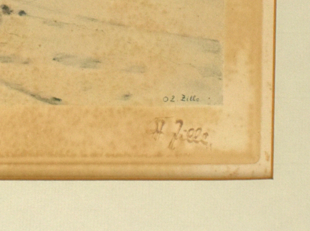 Original-Heliogravüre und Roulette auf Büttenpapier. Blatt 9 des Mappenwerkes „Zwölf Künstlerdrucke“ von 1909 nach einer farbigen Zeichnung von 1902. In der Platte links unten bezeichnet „Rinnsteinkunst“ und unten rechts mit „02. Zille“ und unterhalb der Abbildung unten rechts mit Stempelsignatur von Heinrich Zille (Stempel 3). Rosenbach 28 d. Nicht ausgerahmt. Maße Platte: 31,0 x 23,3 cm. Maße Abbildung: 27,0 x 20,0 cm. Maße Rahmen: 55,0 x 45,0 cm. Blatt wenig braunfleckig. Sehr gutes Exemplar.