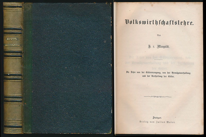 Mangoldt, Hans von: Volkswirthschaftslehre. Die Lehre von der Gütererzeugung, von der Vermögenserhaltung und der Vertheilung der Güter. [Erste Ausgabe]. Stuttgart, Verlag Julius Maier, 1868. 8°. 22 cm. XVII, 491 Seiten. Dunkelgrüner Halblederband mit goldgeprägtem Rückentitel. (Bibliothek der gesammten Handelswissenschaften).