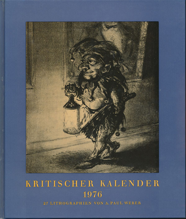 Weber, Paul A.: Kritischer Kalender 1976. 27 Lithographien von A. Paul Weber. 18. Jahrgang. [Vorzugsausgabe mit signierter Original-Lithografie]. München, Bruckmann-Verlag, 1973. Groß-8°. 23 cm. Unpaginiert. Original-Pappband.