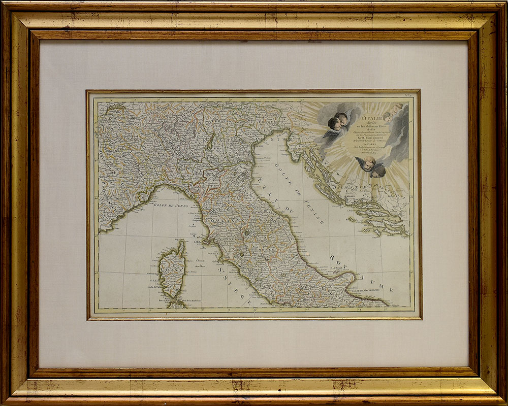 Original copper engraving after Rizzi Zannoni. Map of northern and central Italy with Corsica, parts of France to Provence and the Balkans with Dalmatia and Herzegovina. Expertly framed by a gallery in a gilded wooden frame. Not examined out of frame. Dimensions plate: 31.0 x 45.0 cm. Dimensions frame: 58.0 x 72.0 cm. Frame with a tiny joint. Very good copy.