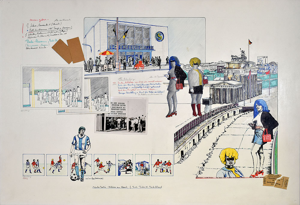Original drawing on cardboard, collage with glued-on tickets, photos. Signed, dated (1973) and inscribed in Indian ink by Bodo Boden below the illustration. In the drawing with numerous entries about visits to museums and the like. Dimensions sheet: 49.7 x 72.5 cm. Dimensions illustration: 39.0 x 62.0 cm. Provenance: From the collection of the writer, artist and television maker Klaus Peter Dencker (born March 22, 1941 in Lübeck-Travemünde, died June 18, 2021). Very good copy.