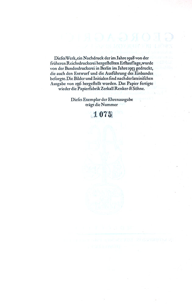 Nummer 1075 der Ehrenausgabe. 2. Auflage, Nachdruck der im Jahre 1928 von der früheren Reichsdruckerei hergestellten Erstauflage. Übersetzt und bearbeitet von Carl Schiffner unter Mitwirkung von Ernst Darmstaedter, Paul Knauth, Wilhelm Pieper, u. a. Herausgegeben und verlegt von der Agricola-Gesellschaft beim deutschen Museum. Druck auf Büttenpapier der Papierfabrik Zerkall Renker & Söhne. Sehr gutes Exemplar.