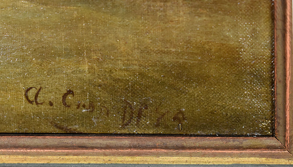 Öl auf Leinwand, unten rechts undeutlich signiert, datiert „Df 48“. Typisches Achenbach-Motiv. Achenbach hatte zahlreiche Adepten die seine Malweise übernahmen. Professionell in einem alten, mehrfarbigen Holzrahmen gerahmt. Maße Abbildung: 45,5 x 65,0 cm. Maße Rahmen: 61,0 x 80,0 cm. Rahmen mit leichten Gebrauchsspuren, berieben. Bild in sehr gutem Zustand.
