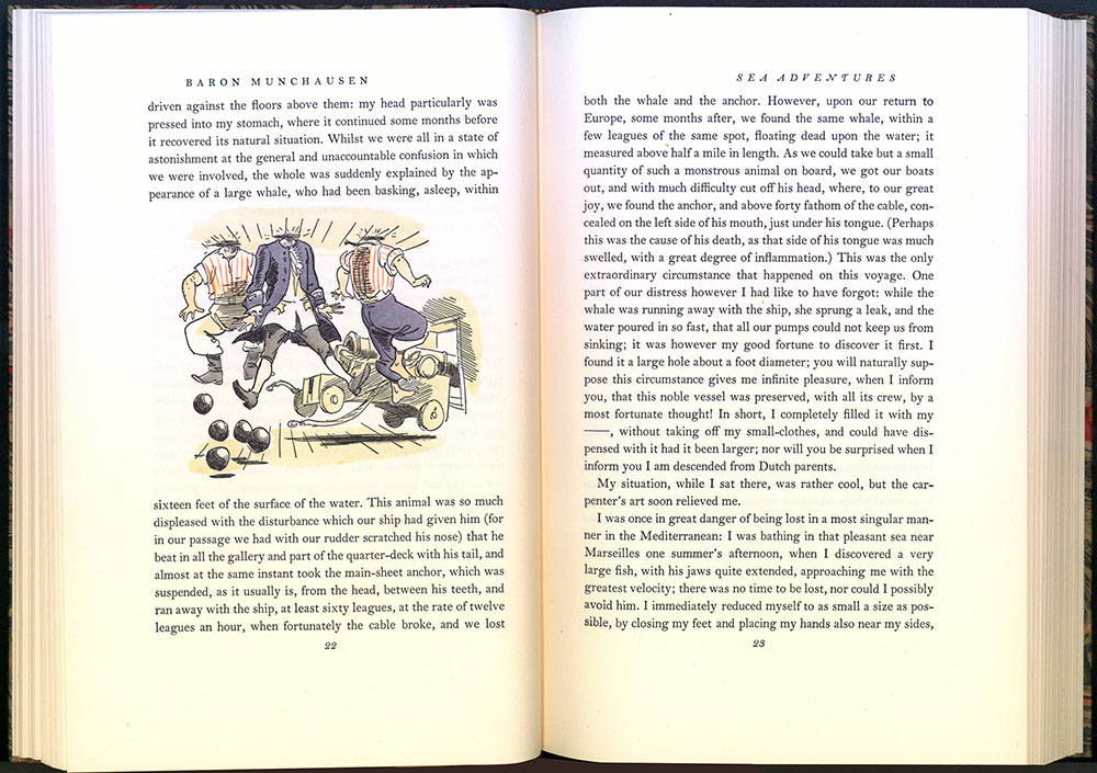 Raspe, Rudolph – Kredel, Fritz: The singular adventures of Baron Munchausen. A definitive text. By Rudolph Raspe and others. Edited, with an introduction, by John Carswell and illustrated by Fritz Kredel. [Signiert, mit 30 handkolorierten Federzeichnungen]. New York, Limited Editions Club, 1952. 4°. 25 x 17 cm. XLI, 175 Seiten. Original-Halblederband mit marmorierten Deckelbezügen und goldgeprägtem Rückentitel im marmoriertem Original-Pappschuber.