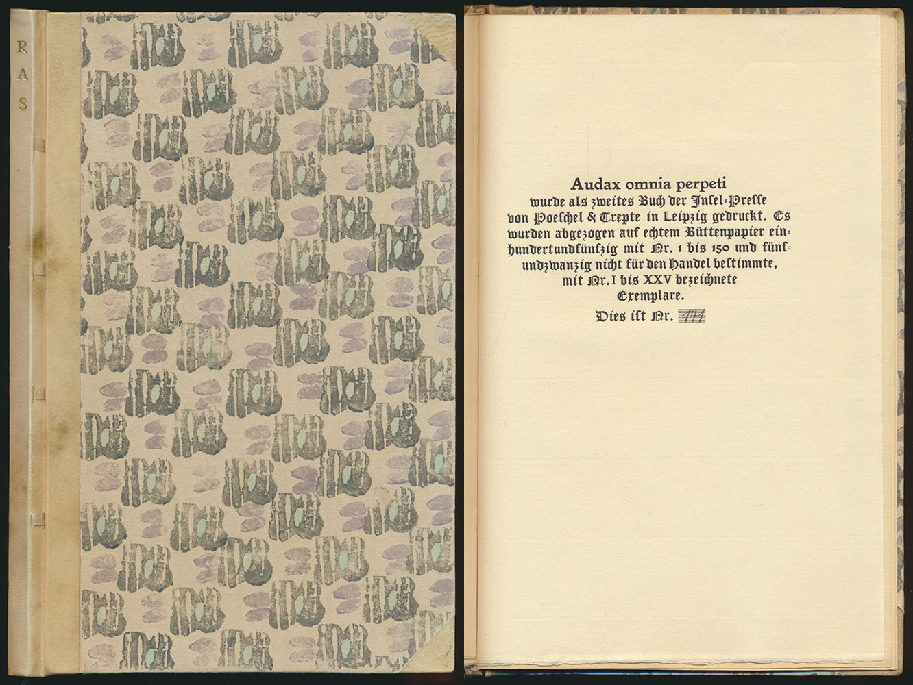 Schröder, Rudolf Alexander: Audax omnia perpeti. Gedichte. Leipzig, Insel Verlag, [1922]. 8°. 22,5 x 15 cm. 41 Seiten, 3 Blatt. Original-Halbpergamentband mit goldgeprägtem Rückentitel und Kopfgoldschnitt. (= 2. Buch der Insel-Presse).