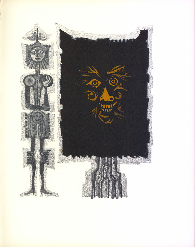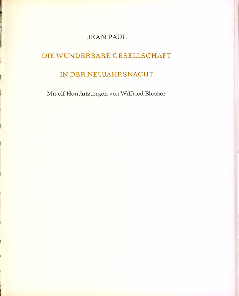 Jean Paul – Blecher, Wilfried: Die wunderbare Gesellschaft in der Neujahrsnacht. Mit elf Handätzungen von Wilfried Blecher. Frankfurt am Main, Verlag Der Goldene Brunnen, 1965. 4°. 30 x 23 cm. 34 Seiten, 1 Blatt. Roter Ganzlederband mit goldgeprägtem Rückentitel auf schwarzem Lederschildchen. Handeinband.
