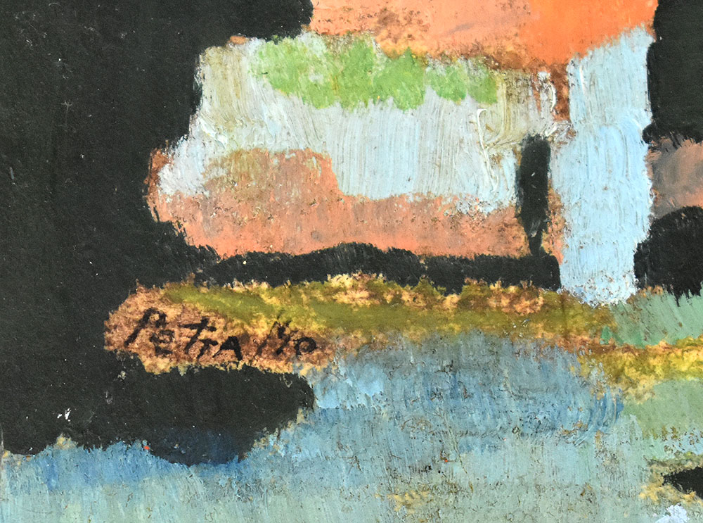 Öl auf Malpappe, von Petra Petitpierre innerhalb des Bildes links unten in Schwarz signiert, datiert (40), rückseitig ebenfalls in Schwarz signiert, datiert mit Adresse und Titel versehen. Gerahmt im einfachen Holzrahmen. Provenienz: Aus dem Nachlass des Kunstsammlers und Autors Ralf Seilheimer. Maße Abbildung/Blatt: 21,2 x 15,5 cm. Maße Rahmen: 32,0 x 26,0 cm. Sehr gutes Exemplar.
