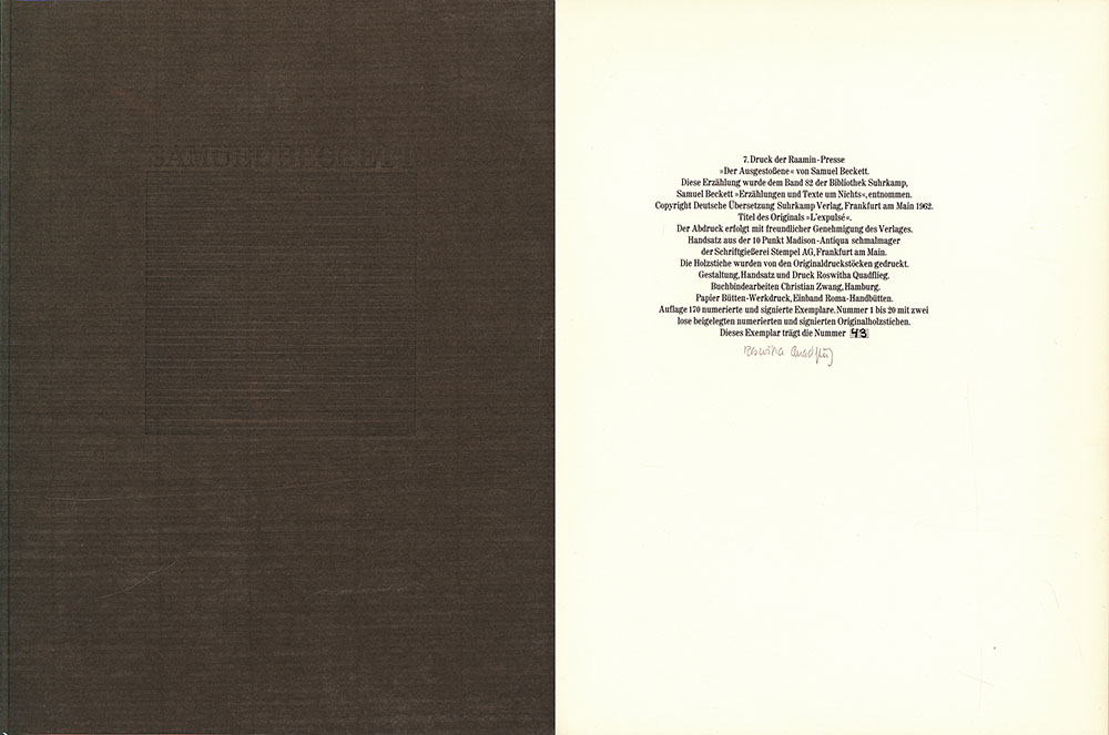 Beckett, Samuel – Quadflieg, Roswitha: Der Ausgestossene. Deutsch von Elmar Tophoven. Mit 11 Holzstichen von Roswitha Quadflieg. [Signiertes Exemplar]. Hamburg, Raamin-Presse, 1976. 4°. 29,5 x 22,5 cm. 35 Seiten. Gebundener Original-Pappband in Roma-Handbütten mit Blindprägungen auf Vorder- und Hinterdeckel. In Klarsichtfolie eingebunden. (= Druck der Raamin-Presse Hamburg, Nr. 7).