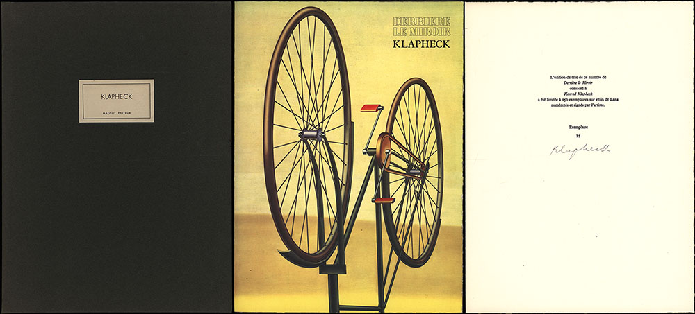 Nummer 35 von 150 nummerierten und von Konrad Klapheck signierten Exemplaren der Vorzugsausgabe. Französischsprachige Ausgabe. Mit zahlreichen Abbildungen. Schuber leicht berieben und minimal fleckig. Rücken der Pappmappe deutlich aufgehellt, mit winzigem Fleck und minimal kratzspurig. Kartonmappe an den Kanten minimal berieben. Sehr gutes Exemplar. Number 35 of 150 copies of the limited edition. French language edition. With many illustrations. Original cardboard folder in original cardboard slipcase. Slipcase slightly rubbed and slightly spotted. Spine of the cardboard folder brightened, with a small spot and with slight crease marks. Inside cardboard folder slightly rubbed at the edges. Fine copy.