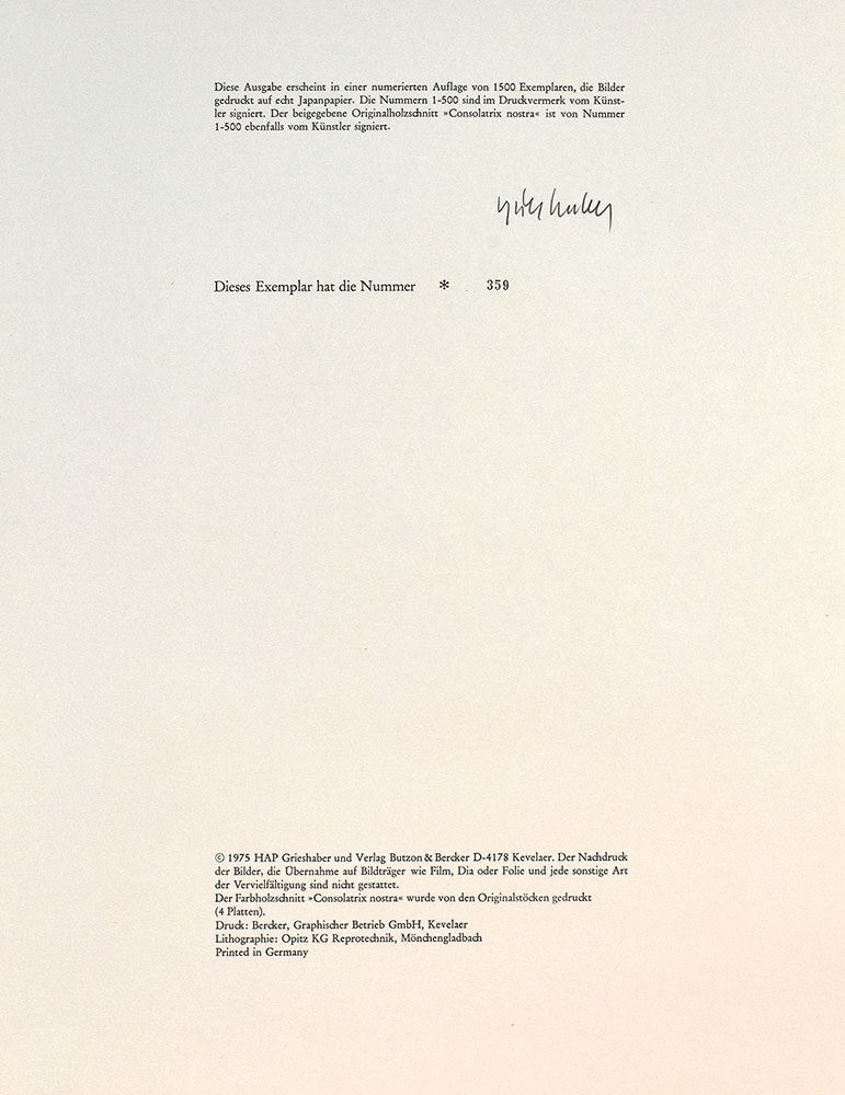 Nummer 359 von 500 (gesamt 3500) nummerierten und von HAP Grieshaber signierten Exemplaren der Vorzugsausgabe mit dem ebenfalls signierten und nummerierten Farbholzschnitt „Consolatrix nostra“, 2°. 44 x 35 cm. Fichtner 230. Werkverzeichnis Fürst 75/2. Neuwertiges Exemplar.