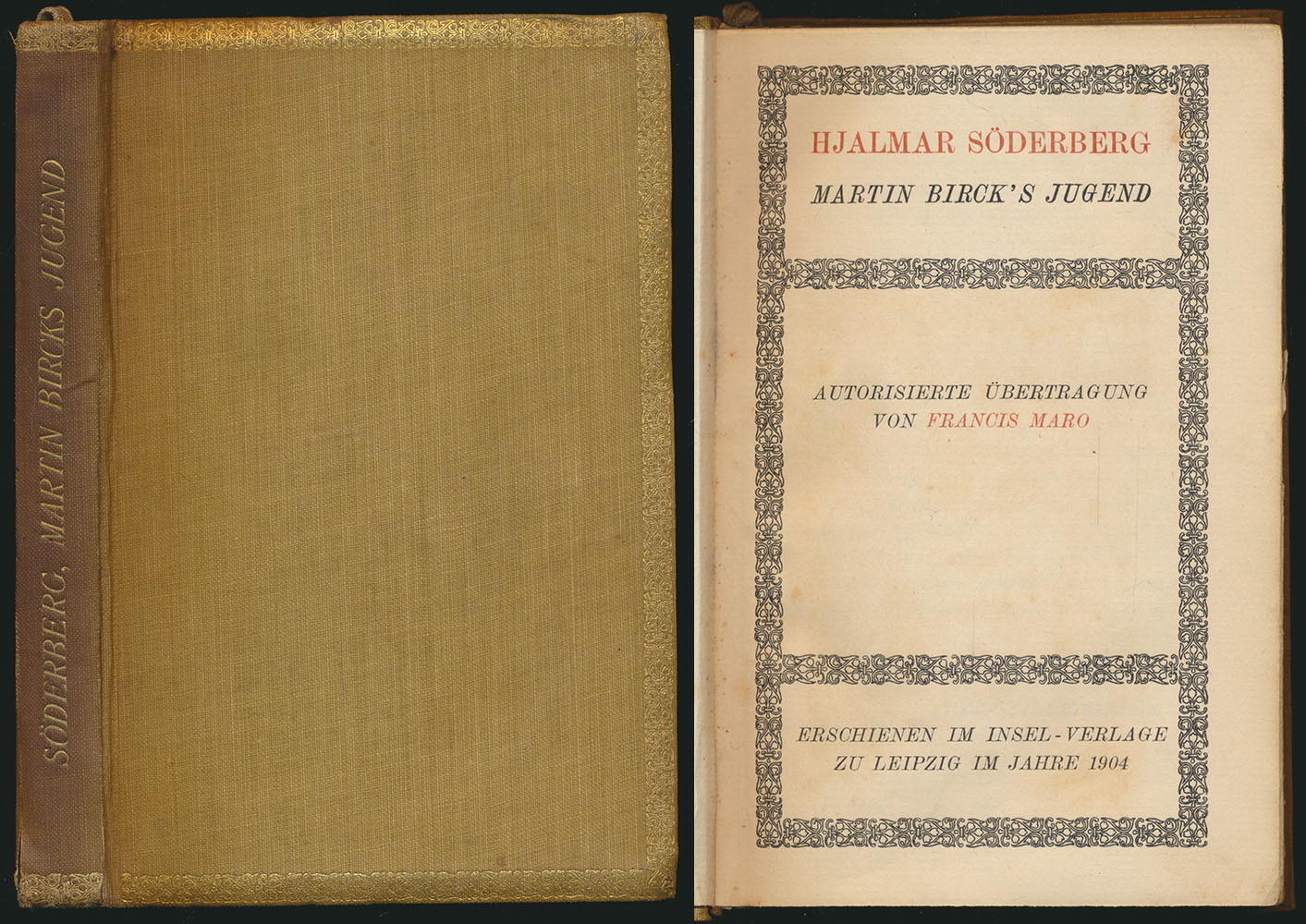 Söderberg, Hjalmar: Martin Birck’s Jugend. Autorisierte Übertragung von Francis Maro. Leipzig, Insel-Verlag, 1904. Klein-8°. 17 x 12 cm. 235 Seiten. Original-Leinenband mit Kopfgoldschnitt.