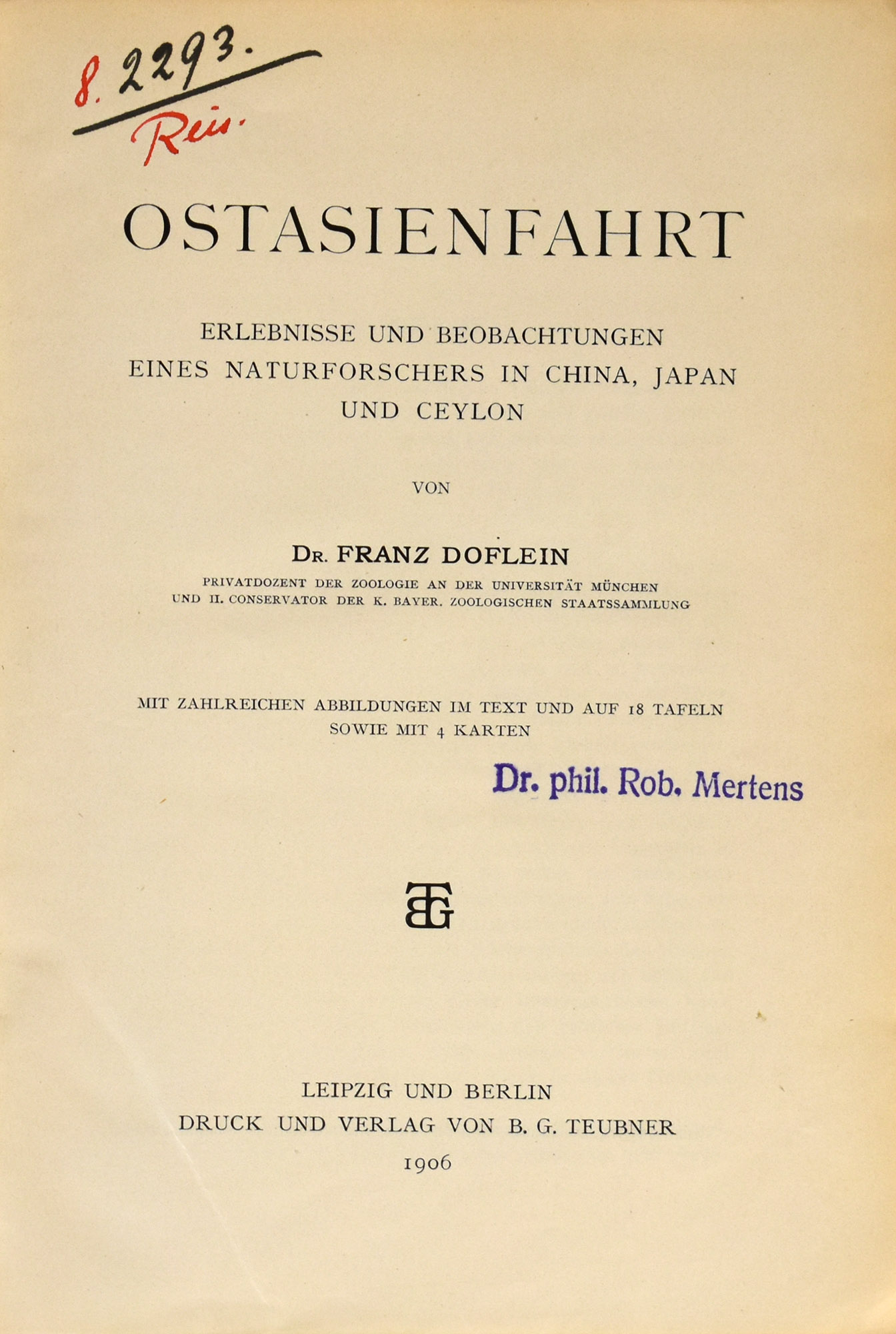 Doflein, Franz: Ostasienfahrt. Erlebnisse und Beobachtungen eines Naturforschers in China, Japan und Ceylon. Mit zahlreichen Abbildungen im Text und auf 18 Tafeln sowie mit 14 Karten. Leipzig und Berlin, Druck und Verlag von B. G. Teubner, 1906. 4°. 25 x 18 cm. XIII, 511 Seiten, [2] Blatt Verlagswerbung. Original-Leinenband mit goldgeprägtem Deckel- und Rückentitel und Deckelillustration. Kopfgoldschnitt.