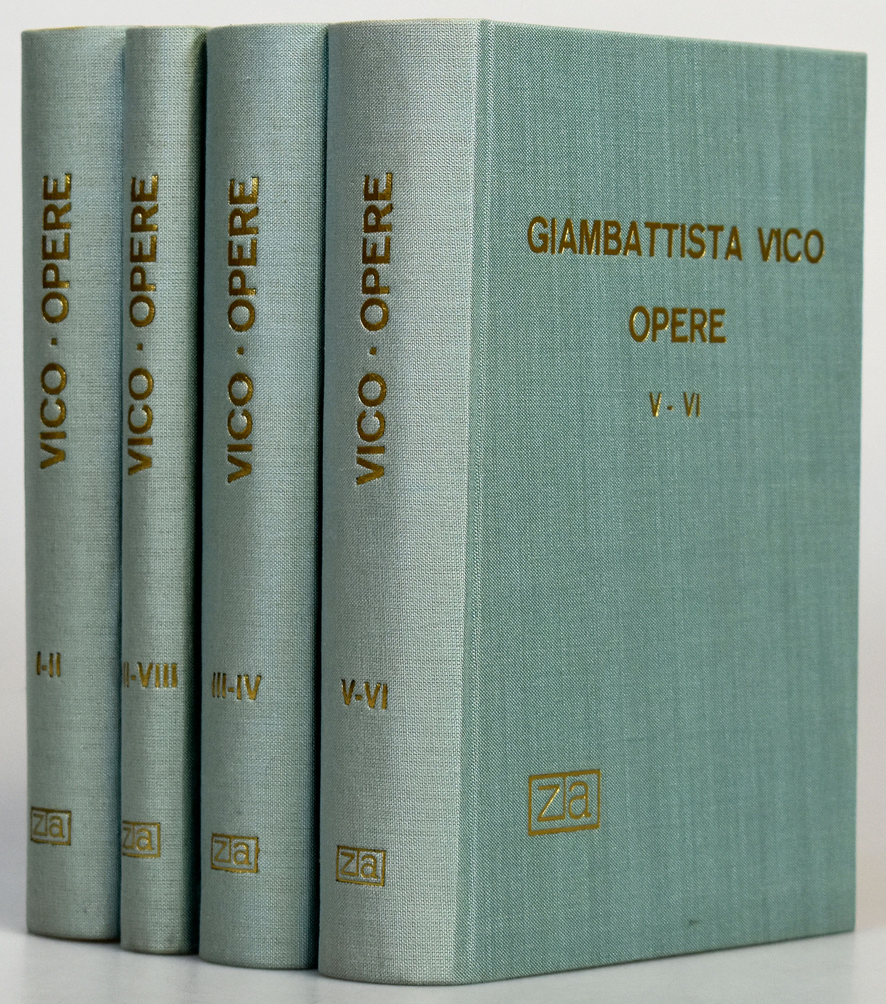 Vico, Giambattista: Opere. 8 Bände (in 4, komplett). Leipzig, Zentralantiquariat der Deutschen Demokratischen Republik, 1970. 8°. 22 x 15 cm. 281, XII, 272, 416, XI, 201, 348, VIII, 358, 134, CXXIII, 72 Seiten. Original-Leinenbände mit goldgeprägten Deckel- und Rückentiteln.