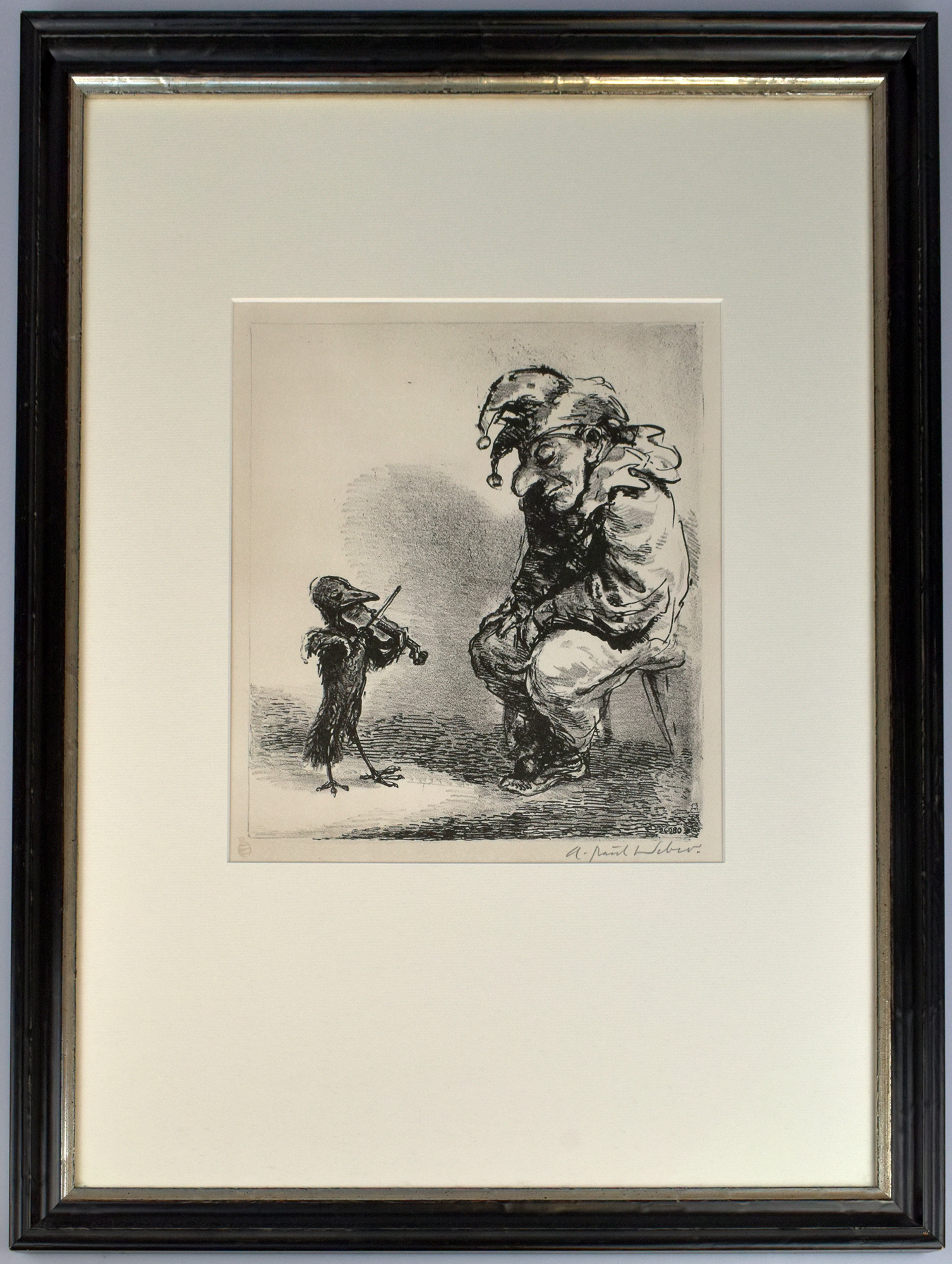 Weber, A. Paul: Kasper mit Schellenkappe. Andante cantabile e consolabile. 26.9.80. [Signierte Original-Lithografie, gerahmt / signed original lithograph, framed]. (A. Paul Weber (Andreas Paul Weber), geboren am 1. November 1893 in Arnstadt, gestorben am 9. November 1980 in Schretstaken bei Mölln, Schleswig-Holstein).