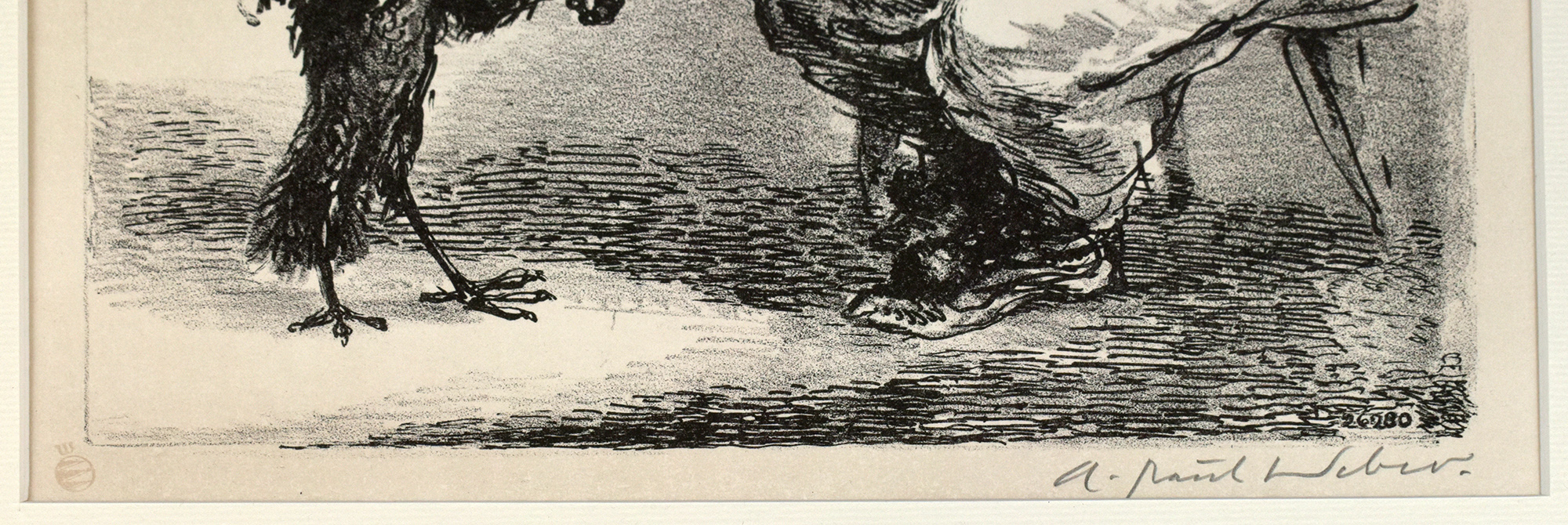 Original lithograph on white laid paper. Marked with the red stamp of the Clan Press at the bottom left, signed in lead by A. Paul Weber on the right. Published as an annual gift of the A. Paul Weber Society in 1980. Catalogue raisonné Dorsch 130. Professionally mounted behind glass/passepartout in a partially gilded, black wooden frame. Not unframed. Frame dimensions: 58.8 x 47.0 cm. Plate/image dimensions: 24.7 x 23.6 cm. Very good copy.